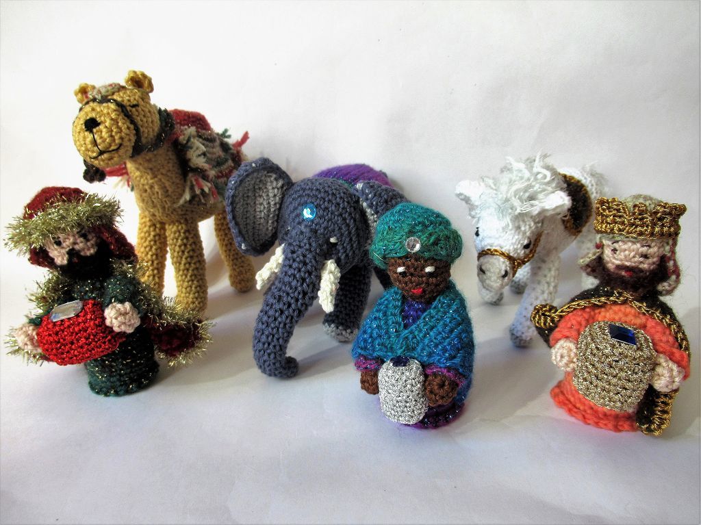 Hier bekommst du die Anleitung für 6 Teile für eine Weihnachtskrippe: die Heiligen 3 Könige Caspar, Melchior und Balthasar und ihre Tiere: Pferd, Kamel und Elefant.