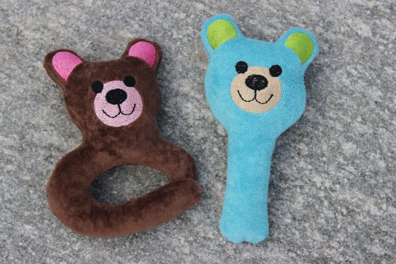 Greifling und Rassel im Bärenmotiv als ITH-Datei d.h. beide werden komplett in der Stickmaschine hergestellt.