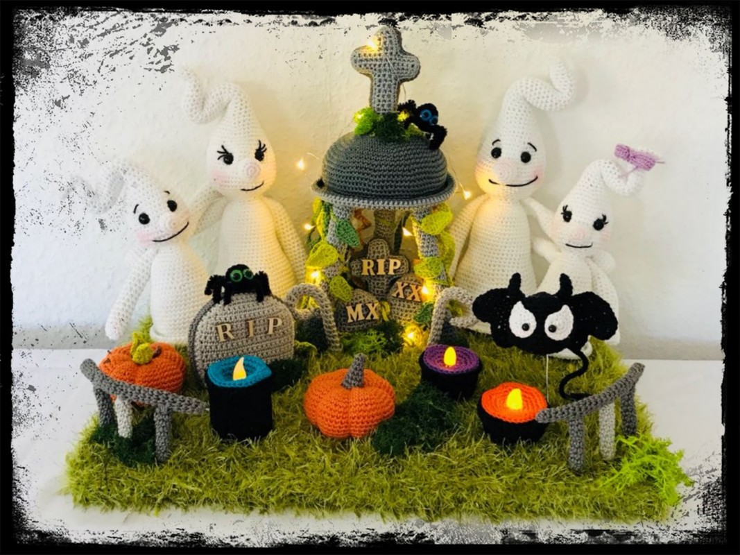 Mit dieser Häkelanleitung könnt Ihr Euch, die im Artikelbild gezeigte Geisterfamilie Grumpatsch auf dem Friedhof zaubern. Neben der niedlichen Geisterfamilie, erhaltet Ihr die Anleitung für einen kompletten Friedhof mit Kapelle.