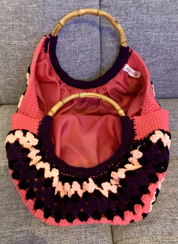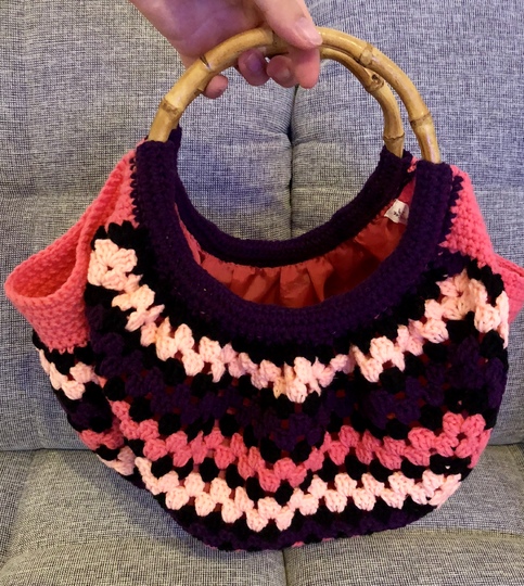 Anleitung für eine Granny Square Bag mit Bambusgriffen und Innenfutter.