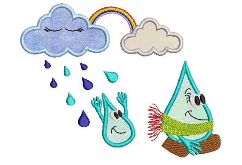 Die Wolken/ Tropfen werden als Applikationen aufgestickt, die Stickmaschine hält nach jedem Stickgang, so können Sie eigene Farbkombis schaffen. Ergänzt mit Regentropfen im Satinstich und anderen kleinen Stickereien.