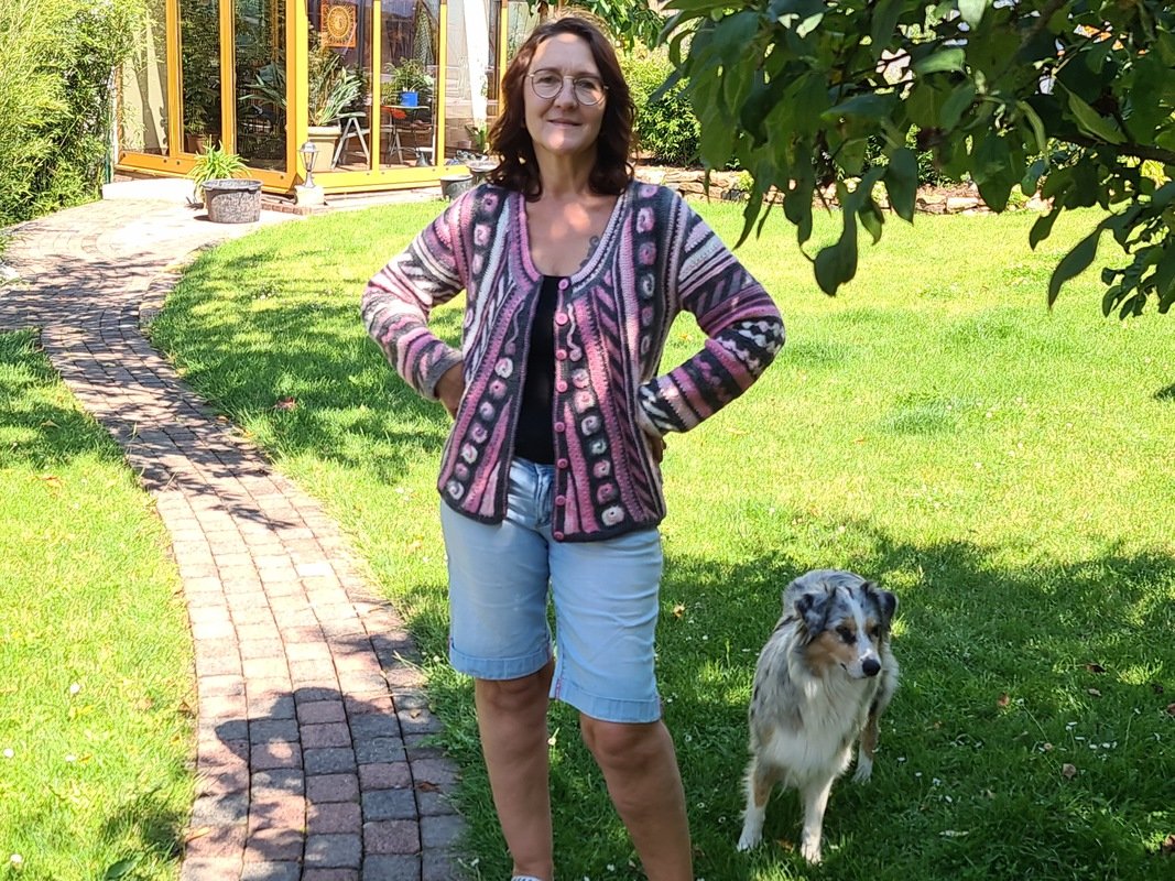 Sie kombiniert die elegante Form eines Kreises am Rücken mit einer klassischen Knopfleiste vorne, die es ermöglicht, die Jacke wie eine normale Strickjacke zu verschließen.