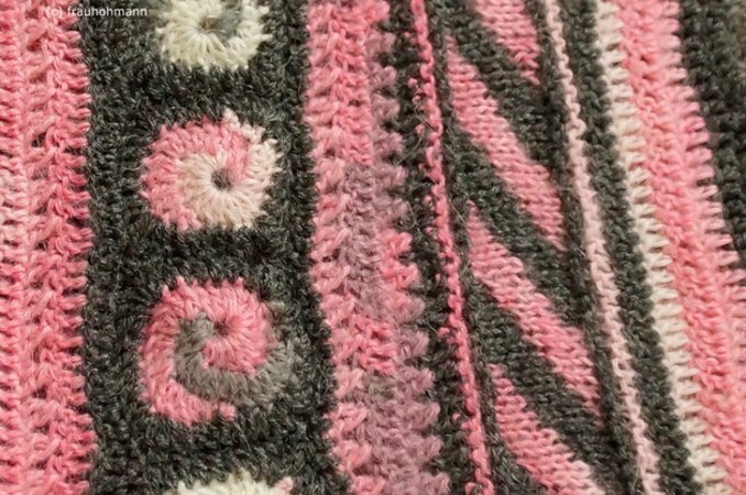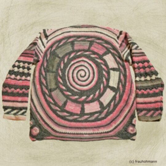 Davon Farbverlaufwolle mit mindestens 3 Farben für die Spiralen: 2/3, Unifarbene Wolle: 1/3 des Gesamtverbrauchs