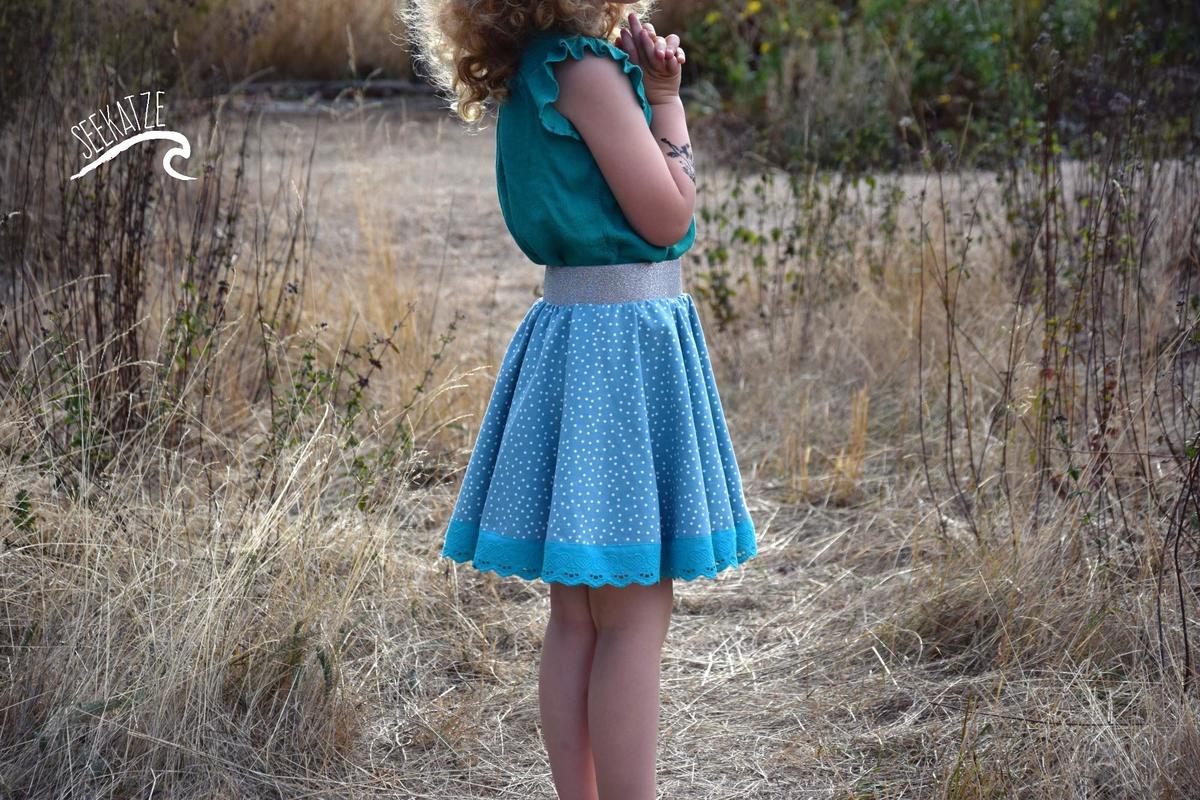 Viele kleine Mädchen, meine Tochter eingeschlossen, lieben Drehröcke und Drehkleider. Und weil sooo viele von euch nach Veröffentlichung meines Kleiderschnittes „Jump & Dance“ den Wunsch nach einem einzelnen Rock, auch in größeren Größen gefragt haben, bin ich dem jetzt nachgekommen: Josie ist ein Drehrock, den man das ganze Jahr über anziehen kann. Es passt auch super zu Strumpfhose und Langarmshirt.