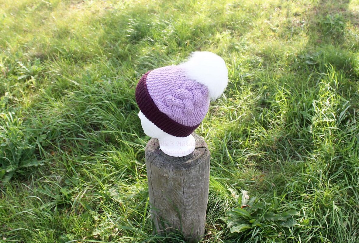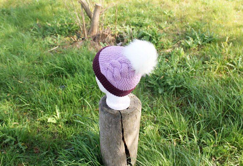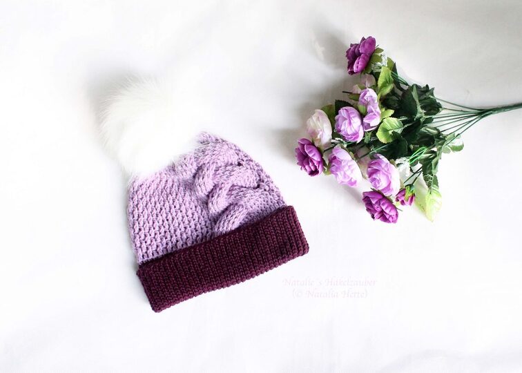 Material: „Originals Wool 125“ von Schachenmayr, 100 % Schurwolle, 50 gr./125 m., Farben: 100 gr. von der Farbe Pflaume (Farbnr.: 144) und 100 gr. von der Farbe Flieder (Farbnr.: 145), (+ 50 gr. mehr für herabhängende Mütze). Alternativen: Partner 3,5 von Phildar, 50gr./111m., 50% Polyamid, 25% Wolle, 25% Acryl, Katia Basic Merino, 52% Merino, 48% Acrylic, 50gr./120m., oder Cool Wool Big Melange, 50gr./120 m, 100 % Schurwolle. Häkelnadel Nr. 4 und evtl. Nr. 4,5 für den Zopf. Pelzbommel oder Pompon-Set von Prym und 50 gr. Wolle Ihrer Wahl.