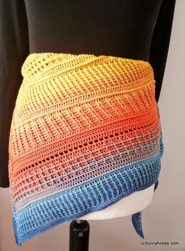 Mit 1250 m, 4-fädig, BW/PA "Lovely" und einer NS 4mm ergab das Tuch eine Größe von 140 x 65 cm (ungespannt).
