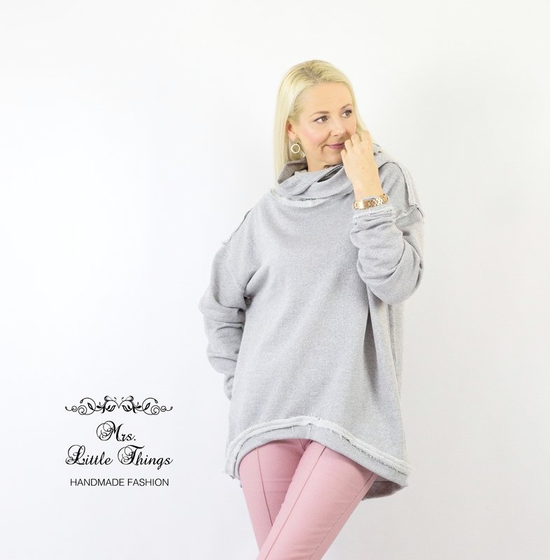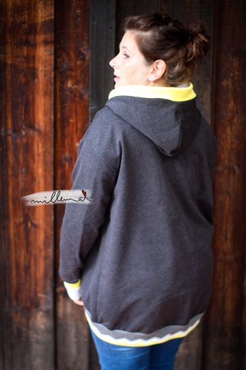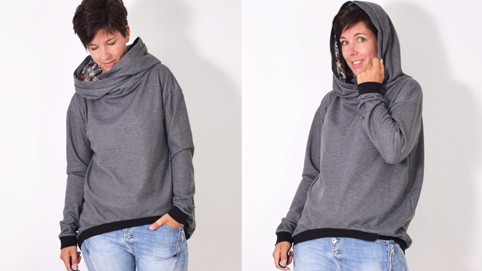 Der OVERSIZED.pulli ist (wie der Name schon sagt) ein großzügig geschnittener Pullover mit lässig überschnittenen Schultern und einer weiten Kapuze, die vorne bis zu den Schulternähten gedoppelt ist.