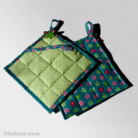 Diese Topflappen kannst du wie einen Handschuh benutzen, da sie vorne ein Einschubfach haben. Sie sind gut wattiert und stabil, aber dennoch griffig in der Hand.