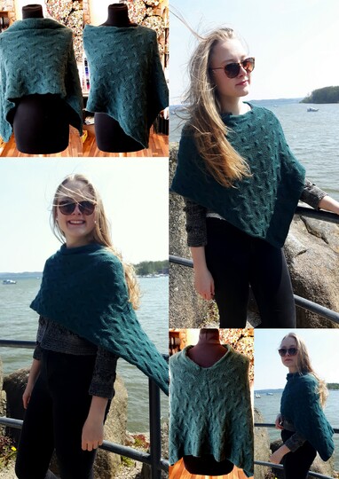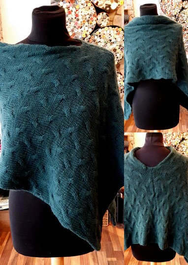 Dieser Poncho ist asymetrisch, aus einem 145 cm langen Schal, der an einer Längseite 40-45 cm zusammen genäht ist. Eigentlich ist die Naht auf einer Schulter, aber man kann sie auch nach hinten tragen, dann ist er vorn kurz und hinten lang, was bei Shoppingtouren sehr praktisch ist, weil man die Hände frei hat