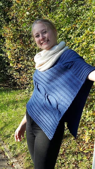 Wärmender, kuschelig weicher Poncho für kühle Zeiten aus weicher Merinowolle mit einer Lauflänge 240m/100g, Nadelstärke 4,0, optional gemischt mit Seide mit einer Lauflänge von 400m/100g und Nadelstärke 3,5 gestrickt.