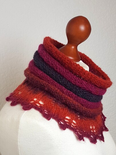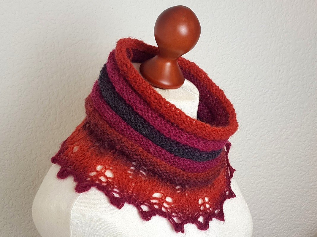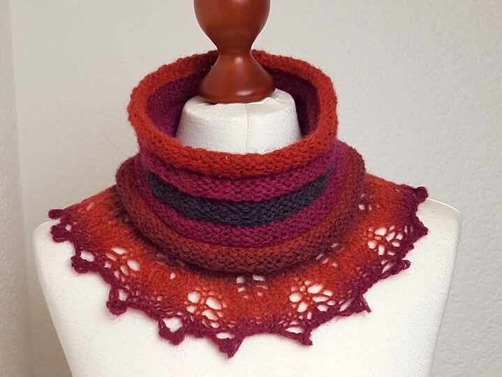 Die schöne Abschlußkante mit einem Ajourmuster runden das Gesamtbild von dem Loop ab. Ganz besonders: die Abkett-Technik, die ich genau im Video und in einer Fotostrecke beschreibe. Sie besteht aus großen Picots dekorativ den unteren Rand umrandet. Die Anleitung besteht aus Text, Fotostrecke, Strickschrift und Video. Die Angaben sind für Nadelstärke 6mm und noch einmal extra für Nadelstärke 3,5 mm. Solltet Ihr Fragen haben, antworte ich zeitnah.