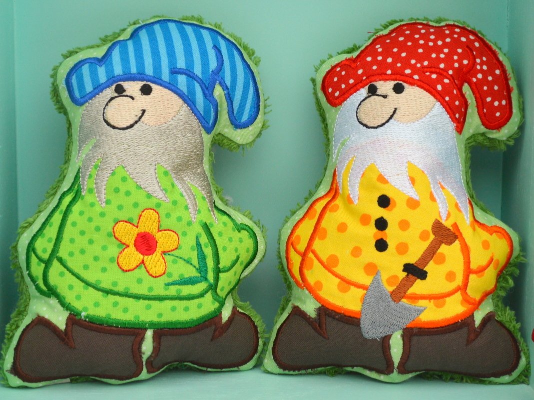 Süße Stickdatei, der Frühling kommt, holt die Gartenzwerge raus!!! Die kleinen Gartenzwerge werden komplett im Rahmen von der Stickmaschine gestickt, Sie müssen lediglich die Wendeöffnung von Hand schließen!