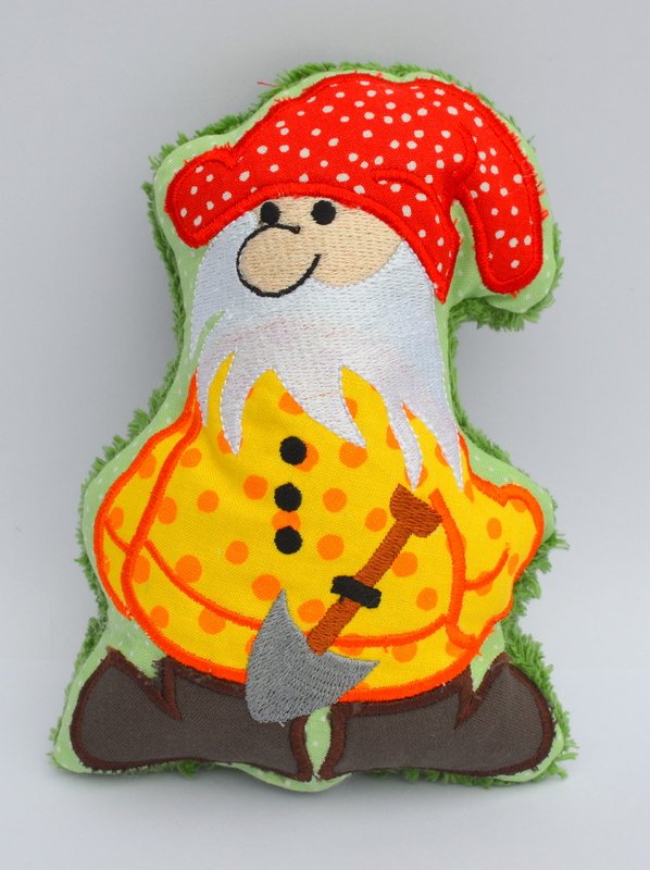 Nach dem Sticken einfach rund herum ausschneiden, durch die Wendeöffnung wenden, mit Polyesterwatte und evtl. einer Rassel füllen. Geschlossen wird der Zwerg von Hand durch einen Matratzenstich oder mit der Nähmaschine zugenäht.