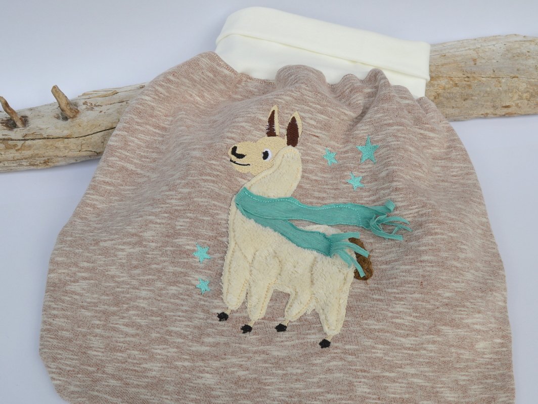 Süße Stickdatei für kleine Lamafreunde im DOODLE-LOOK (Fransenstil). Lama Axel macht sich startklar für den Winter! Ideal für den etwas anderen Nikolaussack!