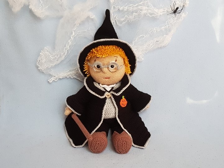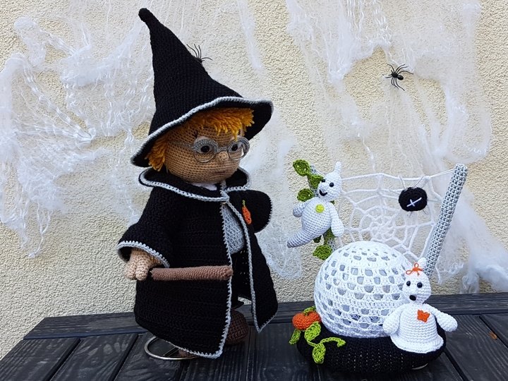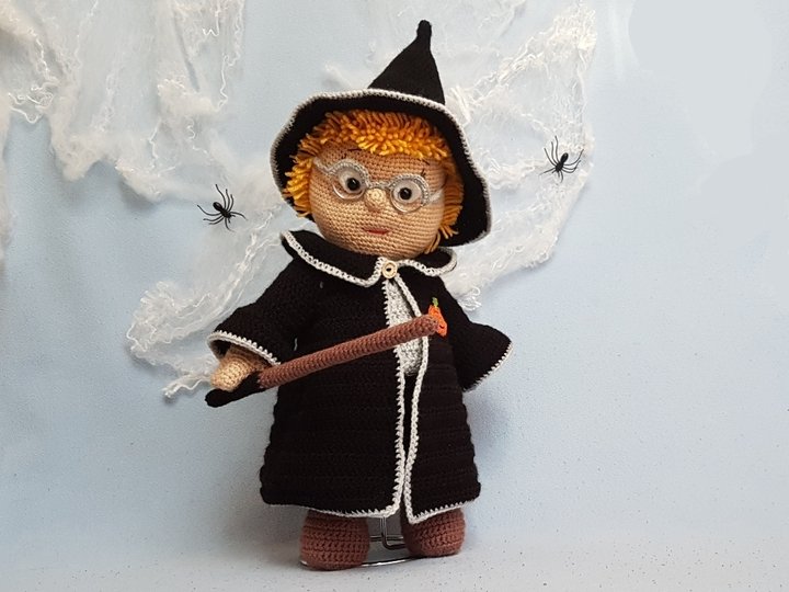 Die Kleidung passt Puppen von einer Größe von ca. 36 cm. Die PDF beinhaltet die Anleitung für die Hose, den Pulli, den Pullunder, den Mantel, den Zaubererhut, die Schuhe, sowie die Brille und den Zauberstab.