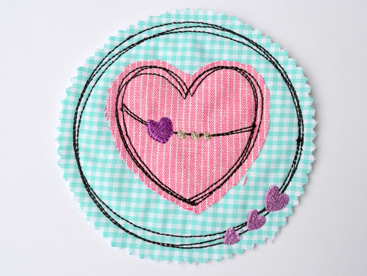 Durch Auflegen verschieden bunten Stoffe während des Stickvorganges erhalten Sie einen Herzbutton in Doodle-Optik mit Stickereien ergenzt, einfach überstehenden Stoff während des Stickvorganges abschneiden. Die Maschine hält nach jeder Farbe/Durchgang, so kann der Rahmen aus der Stickmaschine genommen werden, um den überstehenden Stoff abzuschneiden und neuen Stoff aufzulegen.