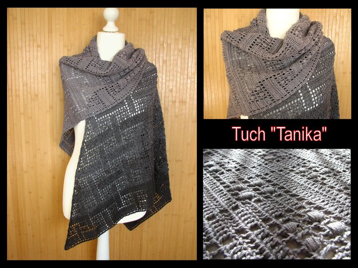 Bei meinem Tuch "Tanika" handelt es sich um ein asymetrisches Dreieckstuch. Das Muster kommt besonders bei einfarbigen Garnen, Ton-in-Ton-Garnen oder Garnen mit sanften Übergängen zur Geltung.