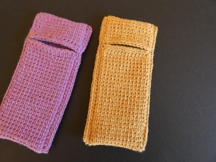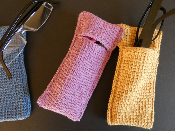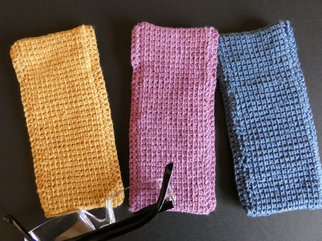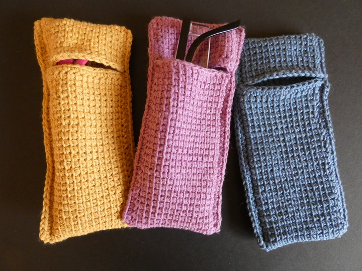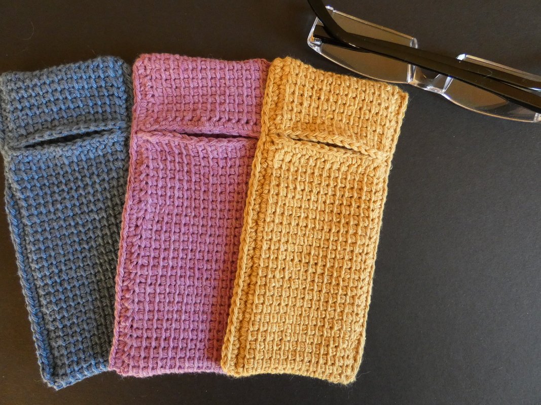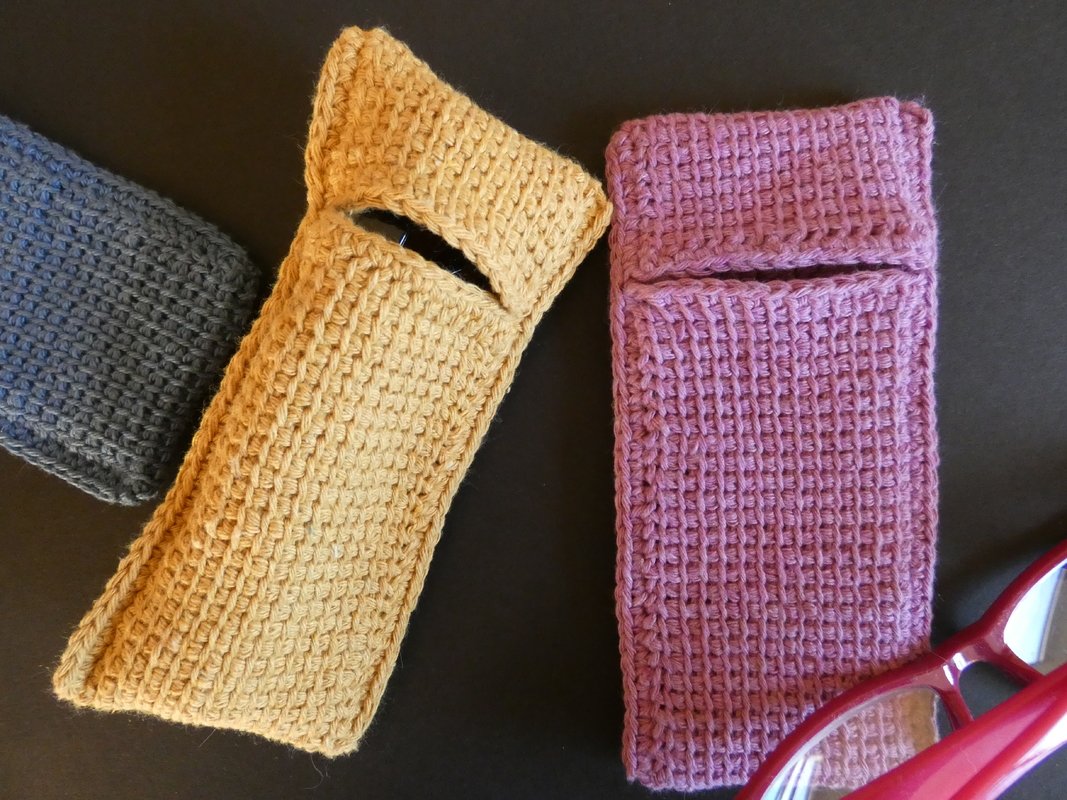 Das Brillenetui wird zum größten Teil tunesisch gehäkelt. So entsteht ein schönes, etwas festeres, Etui für die Brille. Ich nutze meine gehäkelten Etuis für alle meine Lesebrillen. So liegt auch immer eine in meiner Handarbeitstasche. Find ich sehr praktisch.