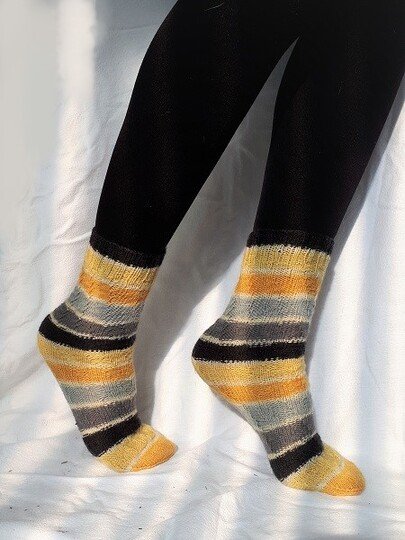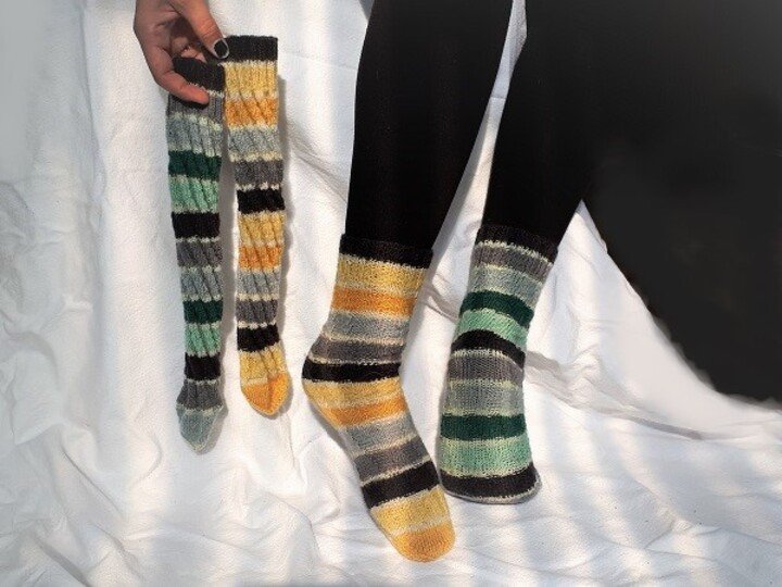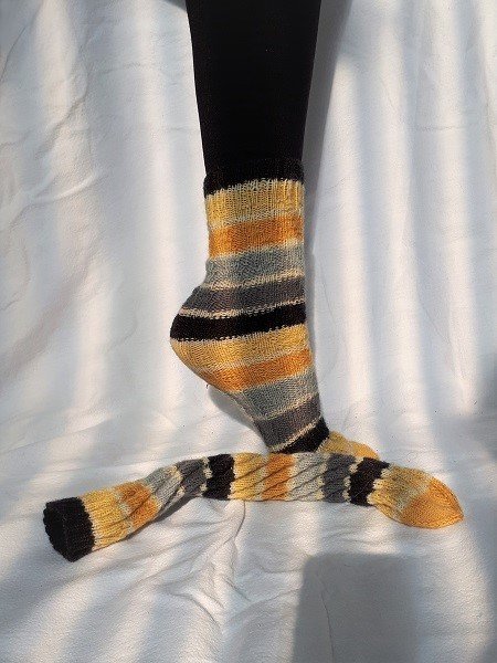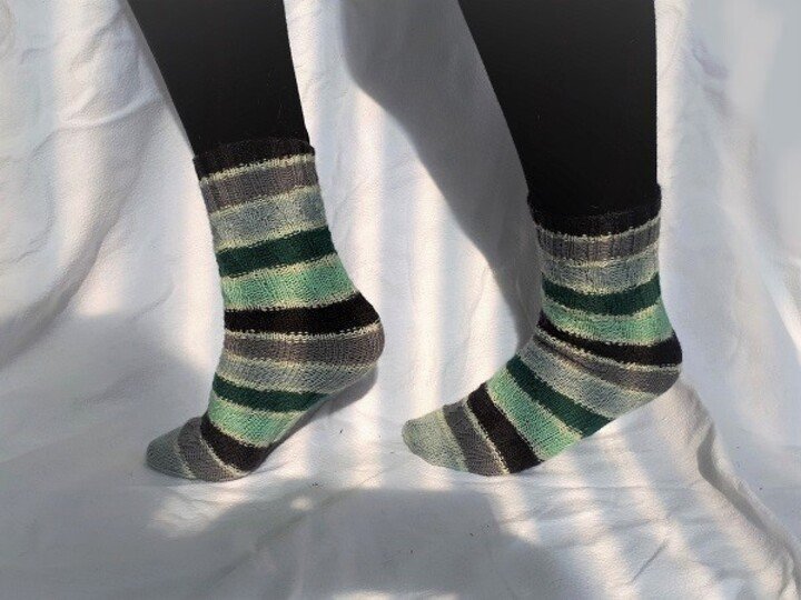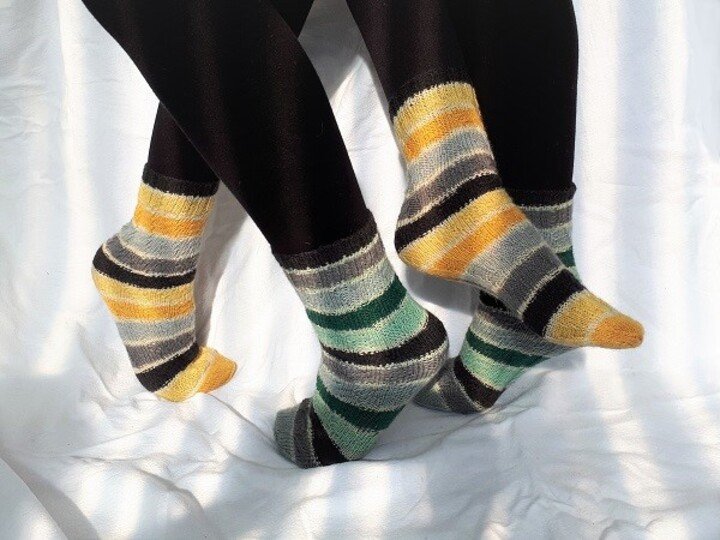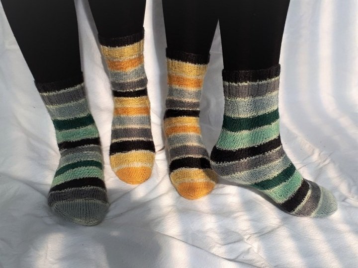 Da sich das Muster nach dem tragen wieder zusammen zieht, entsteht keine Ausbeulung, so dass es theoretisch möglich wäre, das der selbe Socken von Kind und Papa getragen werden kann (wenn der Socken lang genug ist)