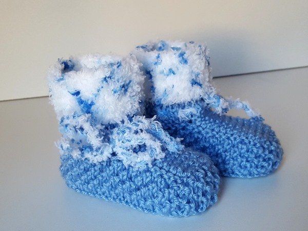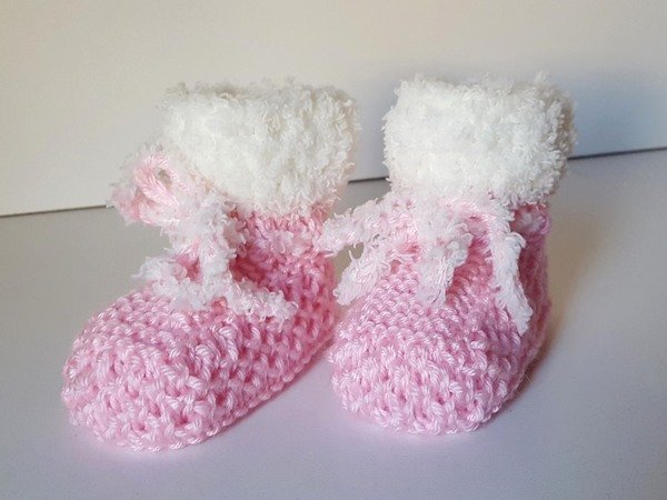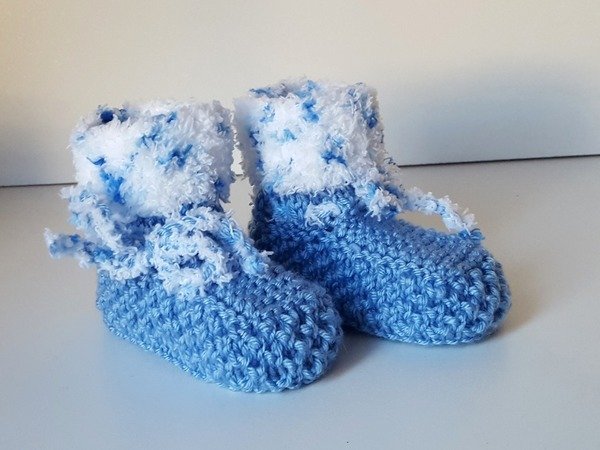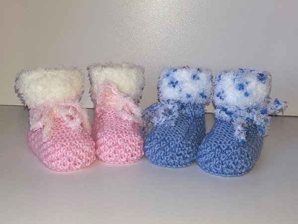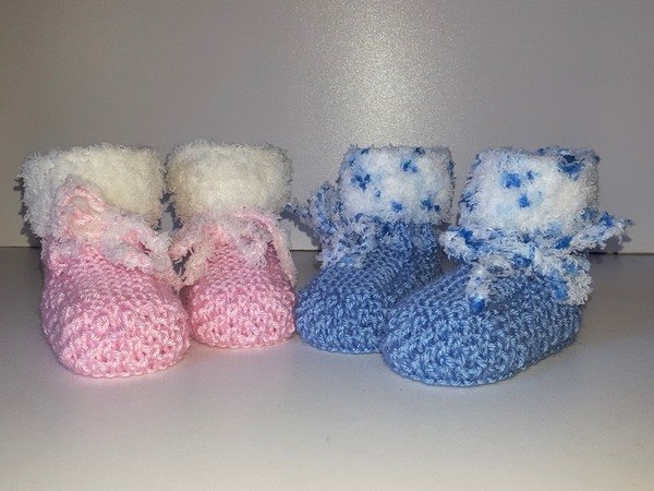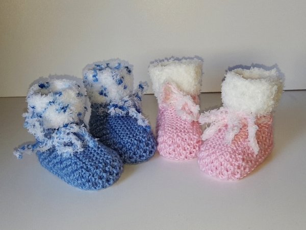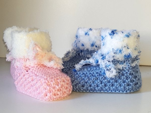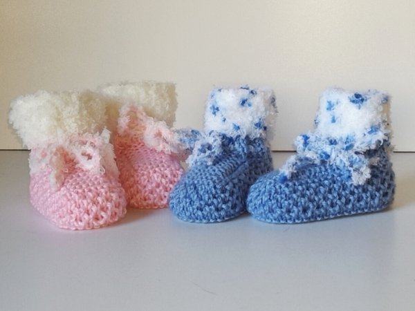 Strickanleitung Babyschuhe mit Plüschrand in 2 Größen ohne Nadelspiel