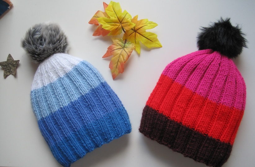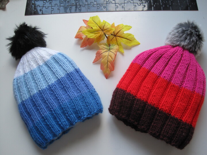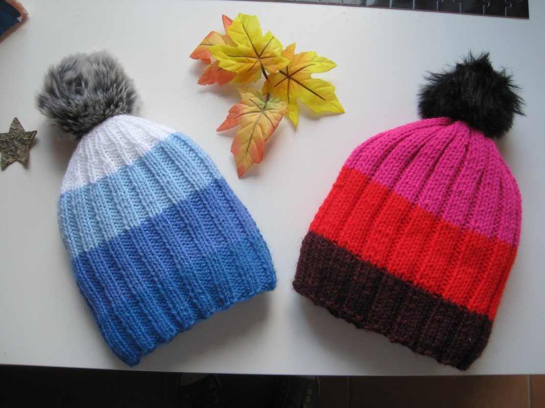 Gestrickt wurde für diese Anleitung mit Rellana Caprice 137 m. Die Maschenprobe ist in der Anleitung zu finden, wie andere Materialangaben. Die Bommel bestehen aus Kunstfell und sind in vielen Wollgeschäften erhältlich, die Mützen sehen aber auch ohne Bommel gut aus, was auf den Bildern gut zu sehen ist.