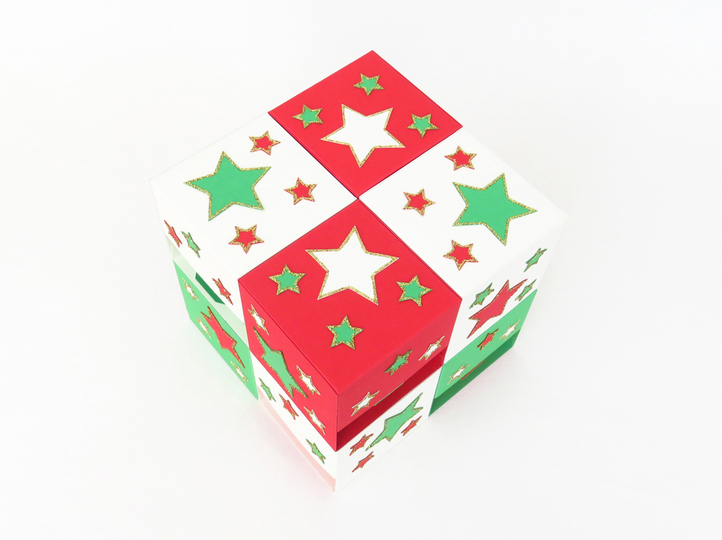Der Kalender ist aus Fotokarton gefertigt und ca. 12,8 x 12,8 x 12,8 cm groß, die einzelnen Behälter sind ca. 6 x 2 x 5,5 cm groß.