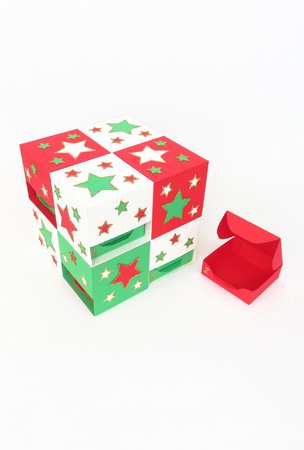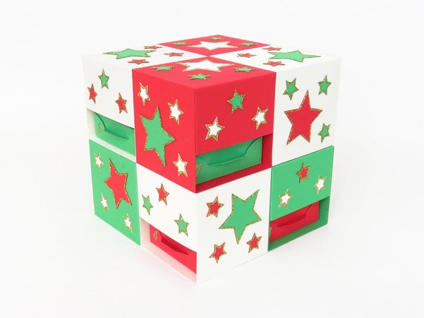 Der Kalender ist aus Fotokarton gefertigt und ca. 12,8 x 12,8 x 12,8 cm groß, die einzelnen Behälter sind ca. 6 x 2 x 5,5 cm groß.