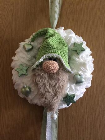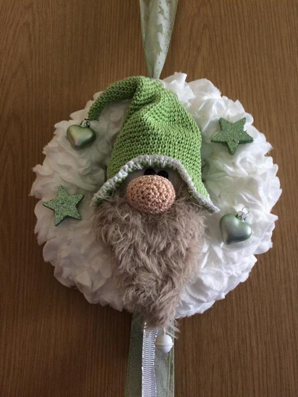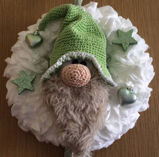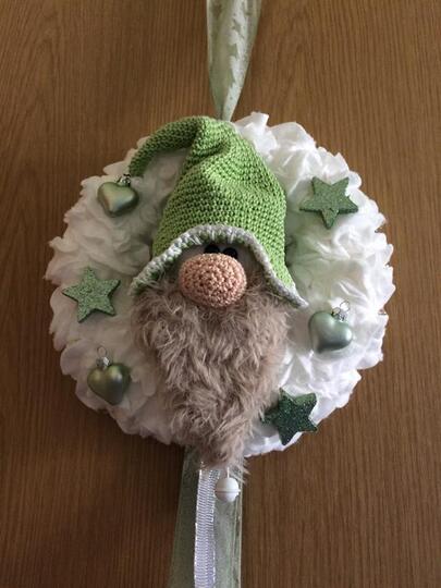 Der Wichtel würde mit Nadel 2.0 gehäkelt , der Durchmesser vom Kranz ist 20 cm .
