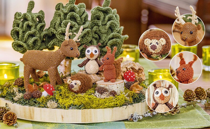 Eichhörnchen, Hirsch, Igel und Eule geben sich hier ein munteres Stelldichein. Mit ein paar Naturmaterialien auf einer Holzscheibe zum Herbstwald arrangiert, werden die gehäkelten Tierchen zu richtigen Dekostars! Mit dabei in der Anleitung sind auch ein gehäkelter Baum und ein Häkelpilz.