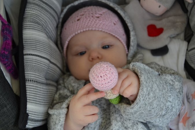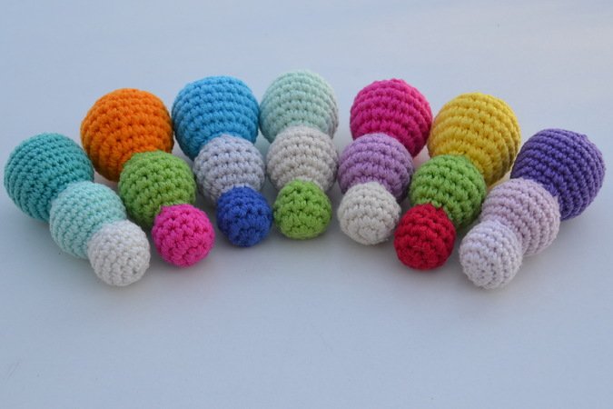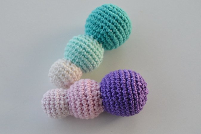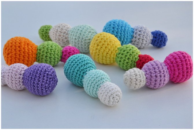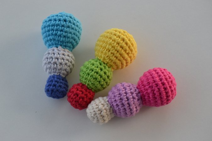 Da in meinem Familien- und Bekanntenkreis einige Babys zur Welt gekommen sind, zaubere ich gerade einige Kleinigkeiten für kleine Babyhände. Da ich gelernte Holzspielzeugmacherin bin, habe ich mir besonders viele Gedanken gemacht und herumgetüftelt. So ist der Motorikgreifling BUBBLES, aus Lieblingsfarben No.2 von myboshi entstanden. Das Garn ist speichelecht und die leuchtenden Farben regen das Interesse von Babys an. Daher ist es perfekt geeignet.