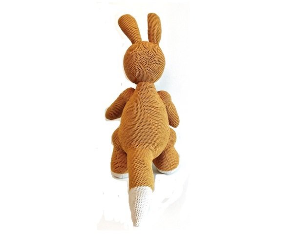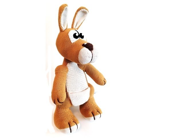 Das fertige Känguru wird ca 45 cm groß. Natürlich kann die Größe variieren, je nachdem ob man fest oder locker häkelt. Auch die Wahl der Wolle ist entscheidend. Ich selbst häkle mit Apollo Baumwollgarn 125m/50g (100% Baumwolle).