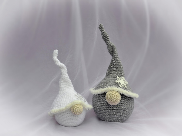 Ich habe den größeren Wichtel mit silberner Acrylwolle mit Metalleffekt und Häkelnadel 3,5 mm gehäkelt,
