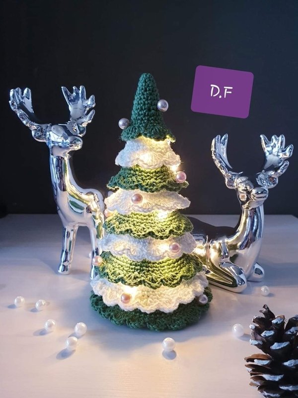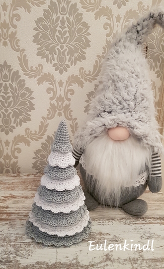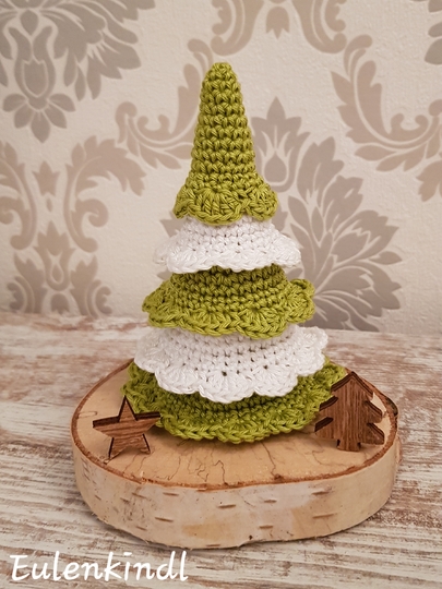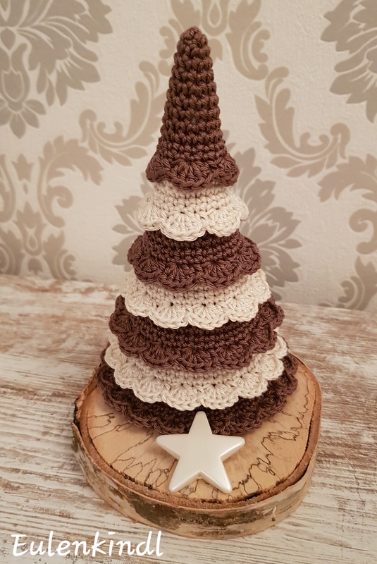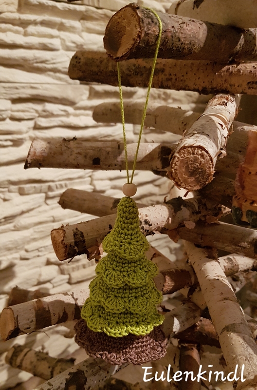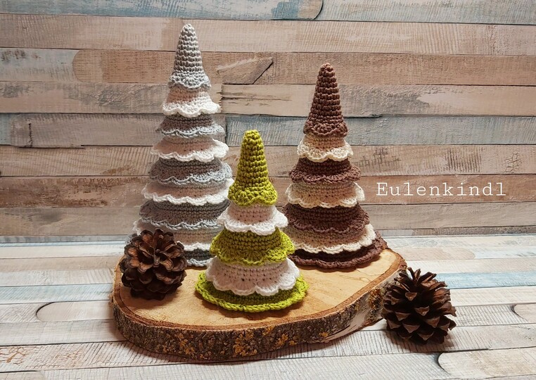 Die Tannenbäumchen wurden mit Baumwollgarn (50g-125m) und einer 2,5 Nadel gehäkelt, der braun/beige ist 16cm hoch.