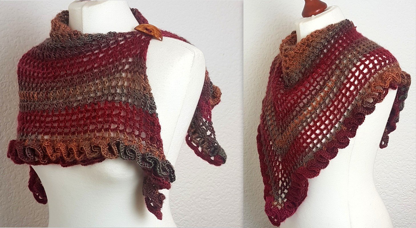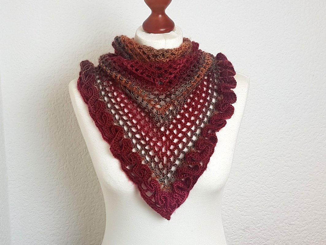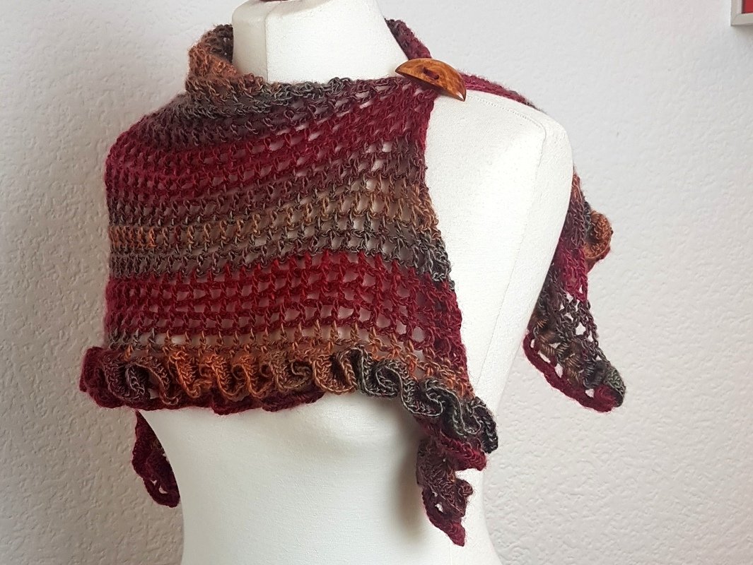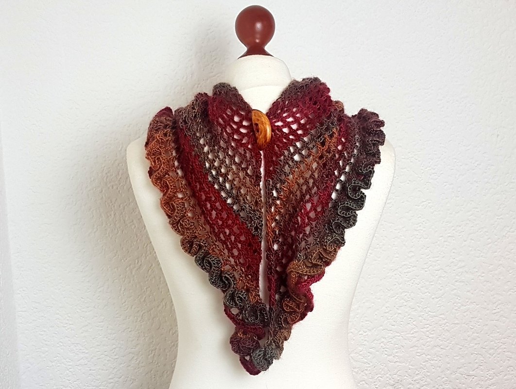 Klein, aber sehr fein! Ein raffiniertes Dreieckstuch mit Rüschen und mit vielen Tragemöglichkeiten! Das Tuch lässt sich einmal quer oder mit der Spitze nach vorne tragen. Die Rüsche geht einmal um die untere Kante und ist ein absoluter Hungucker bei diesem Tuch. Sie wird im Anschluss aufgehäkelt. Der Knopf sorgt für einen sicheren Halt, Ihr braucht das Tuch also nicht zu knoten. Die reich bebilderte Anleitung (22 Bilder) führt auch Anfänger erfolgreich ans Ziel:) Der Text und die Häkelschrift unterstützt Euch ebenfalls. Falls Fragen auftauchen, antworte ich zeitnah.