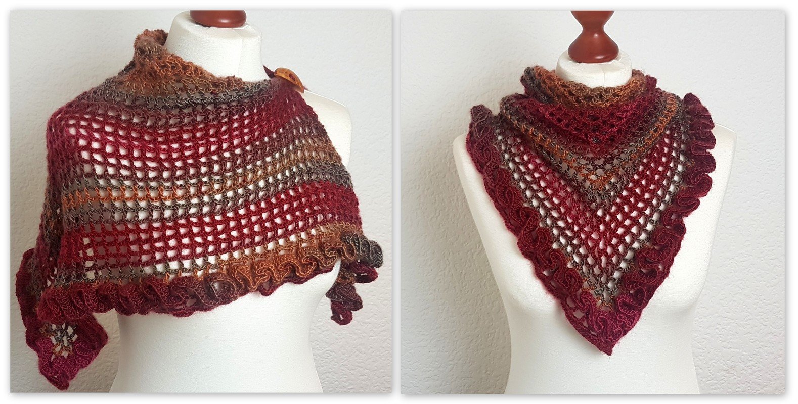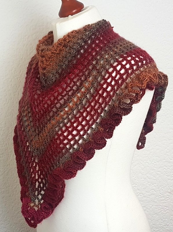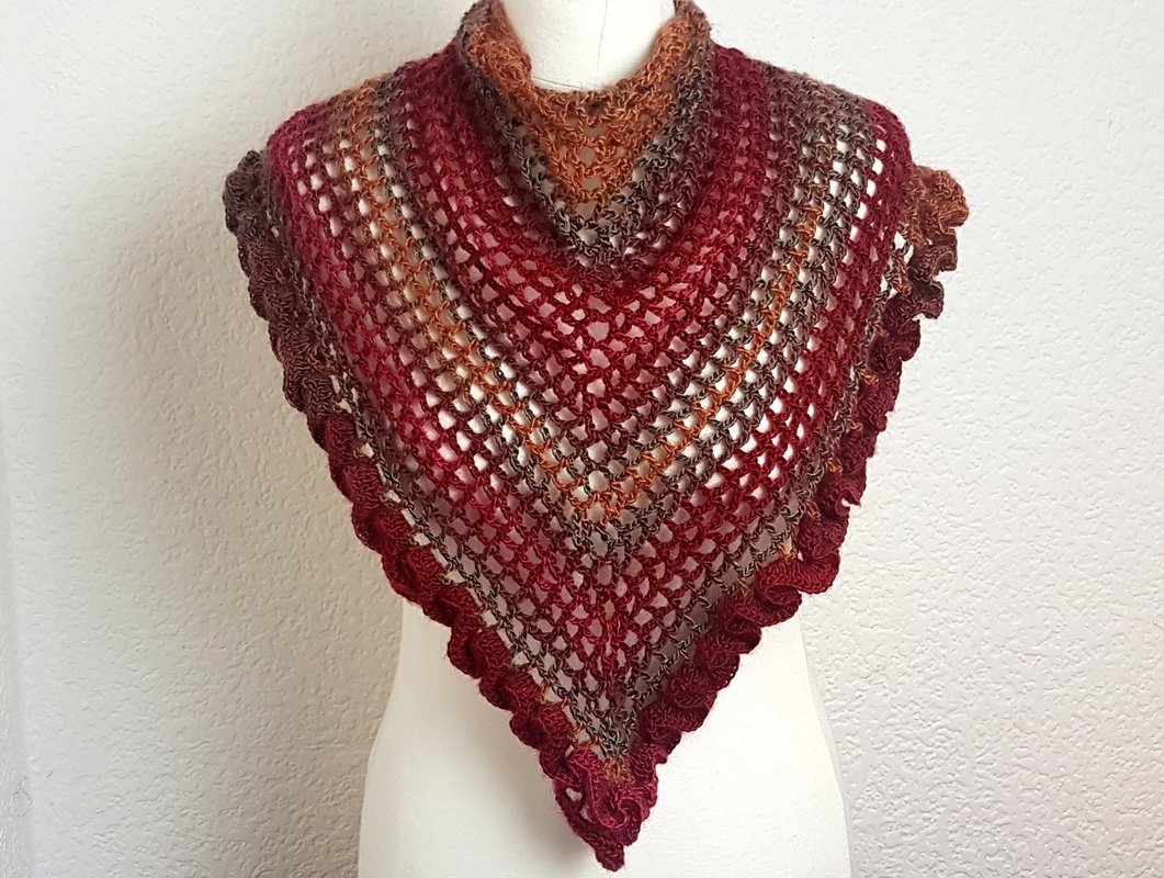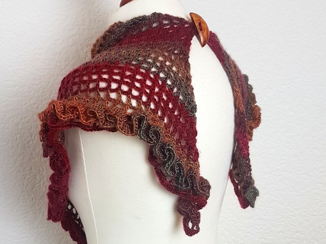 Klein, aber sehr fein! Ein raffiniertes Dreieckstuch mit Rüschen und mit vielen Tragemöglichkeiten! Das Tuch lässt sich einmal quer oder mit der Spitze nach vorne tragen. Die Rüsche geht einmal um die untere Kante und ist ein absoluter Hungucker bei diesem Tuch. Sie wird im Anschluss aufgehäkelt. Der Knopf sorgt für einen sicheren Halt, Ihr braucht das Tuch also nicht zu knoten. Die reich bebilderte Anleitung (22 Bilder) führt auch Anfänger erfolgreich ans Ziel:) Der Text und die Häkelschrift unterstützt Euch ebenfalls. Falls Fragen auftauchen, antworte ich zeitnah.