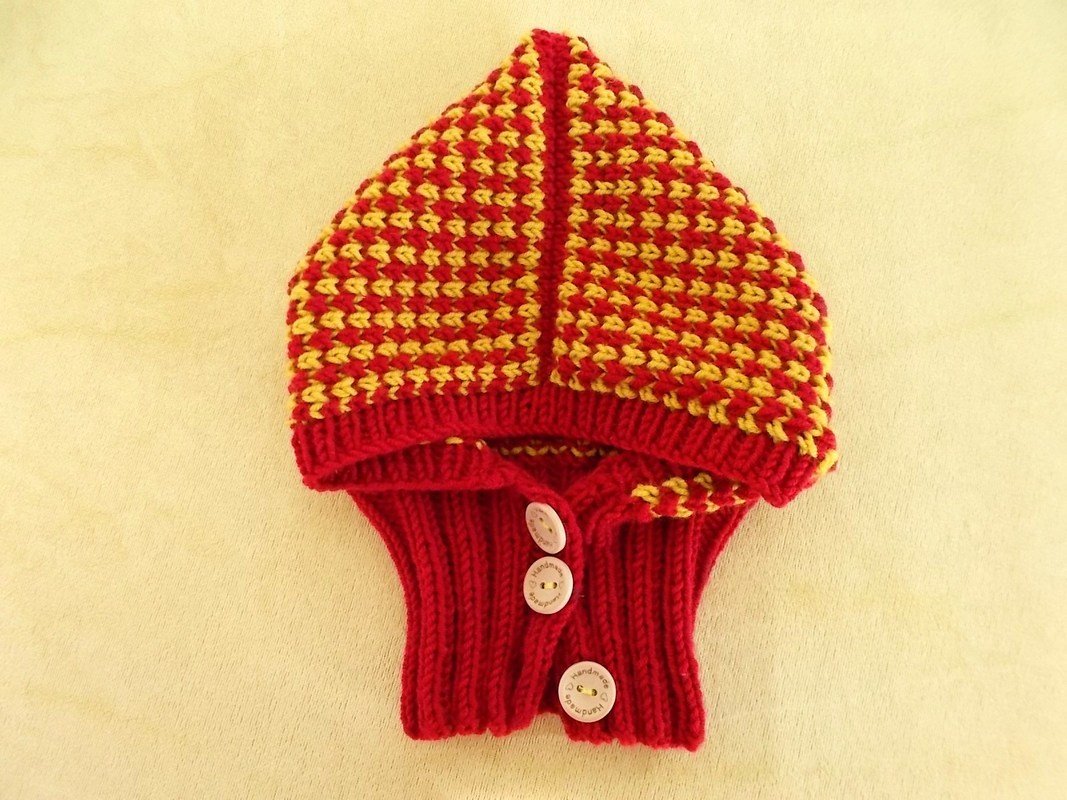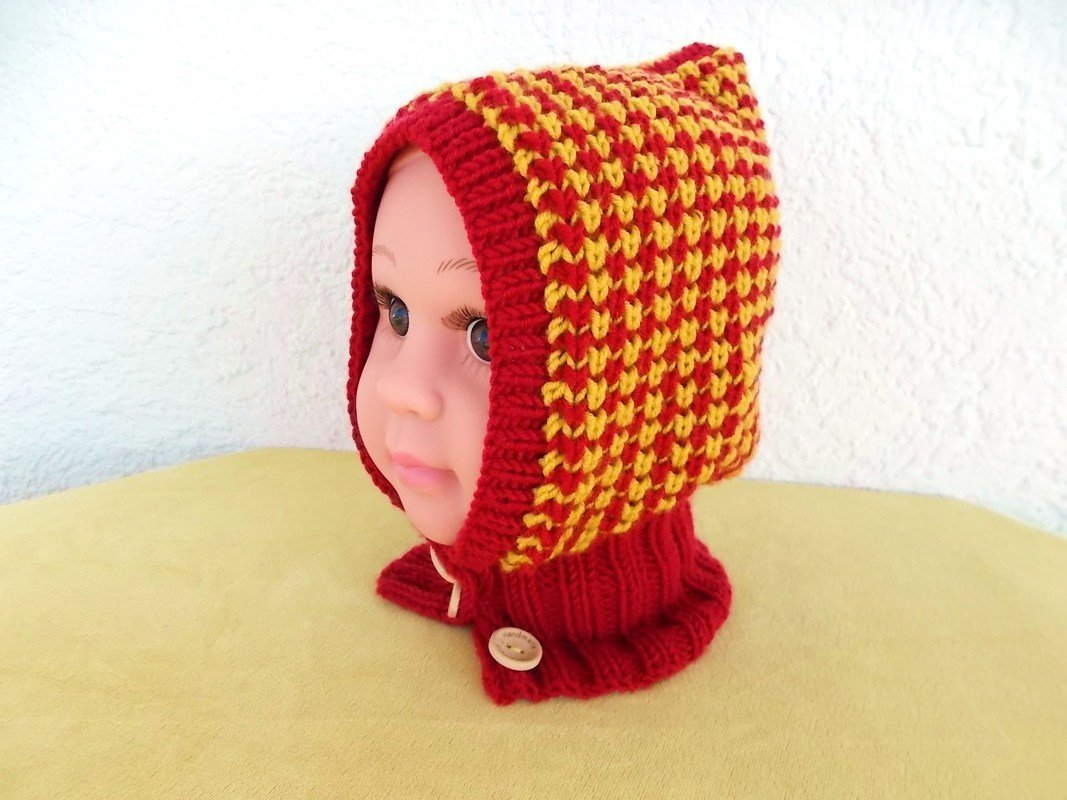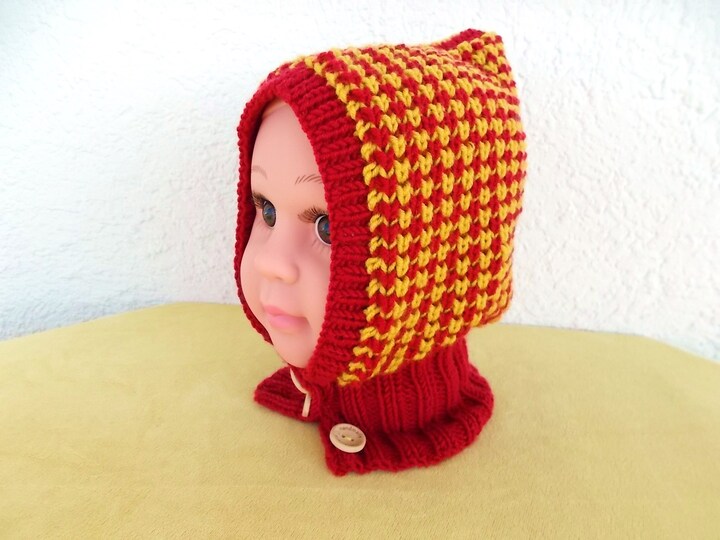 Hier bekommst du eine Strickanleitung für eine Kindermütze mit einem Schalkragen. Die Mütze kann wie eine Schlupfmütze über den Kopf gezogen werden. Man kann aber auch vorne die Knöpfe öffnen und die Mütze ganz normal anziehen, was bei Kleinkindern sicher vorteilhafter ist.