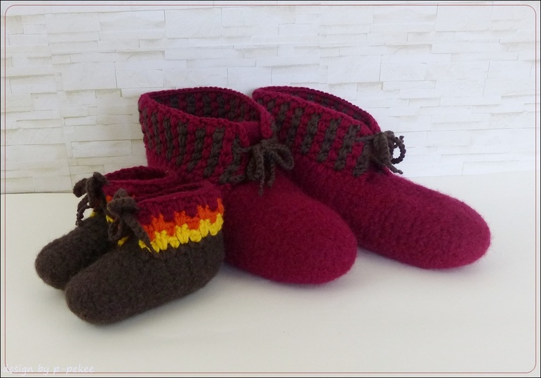 Die Anleitung beinhaltet die Anfertigung der Filzschuhe in Größe 20 - 47 (Tabelle mit einzelnen Daten). Die Filzschuhe sind einfach und schnell von der Spitze zur Ferse in einem Stück gehäkelt. Der Kragen wird nach dem Filzen angehäkelt.
