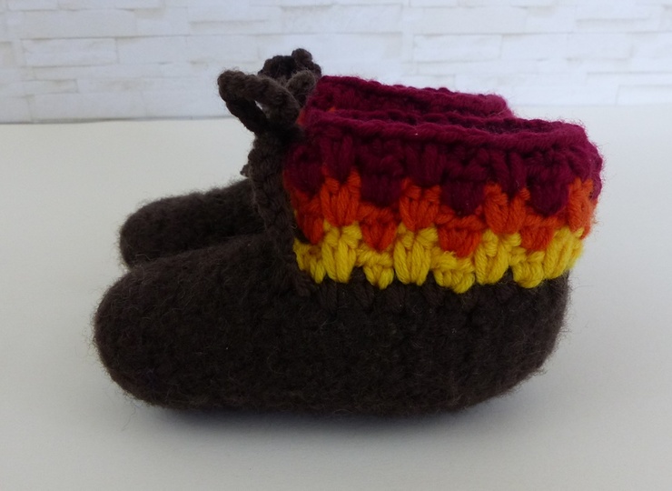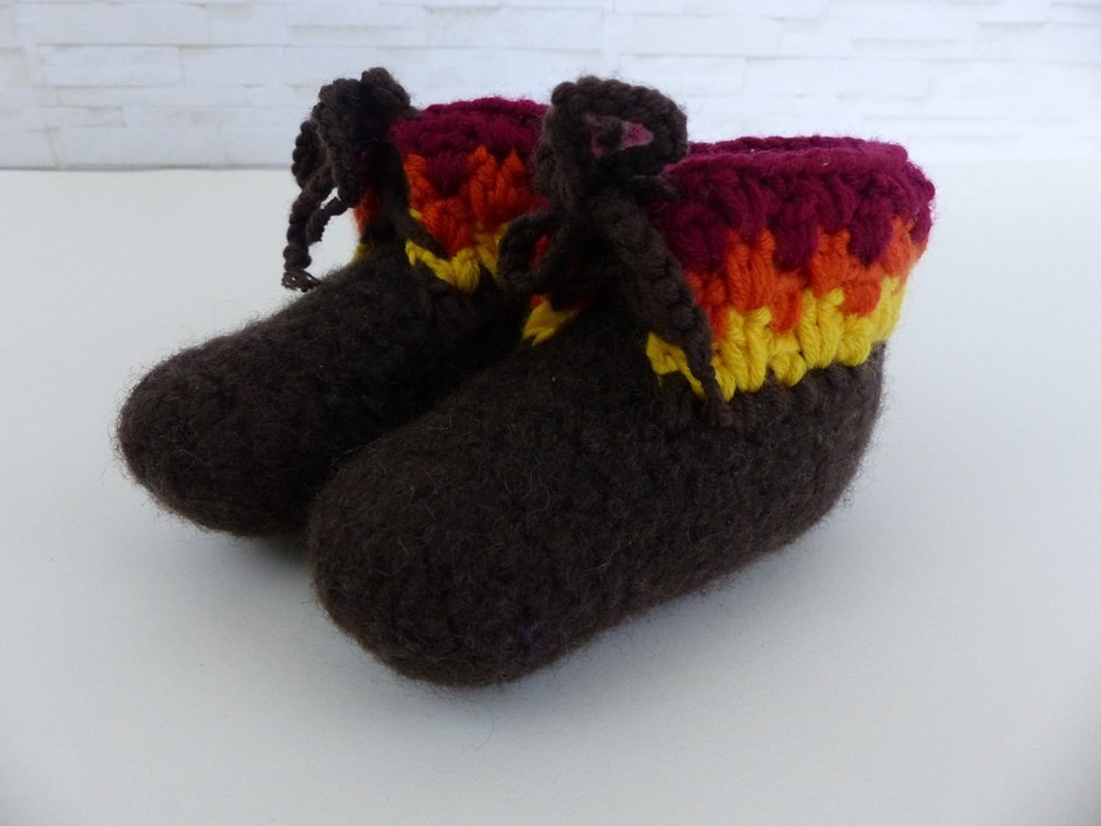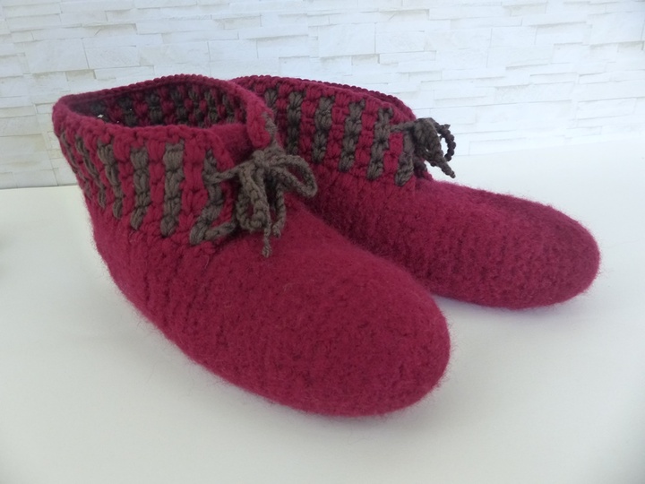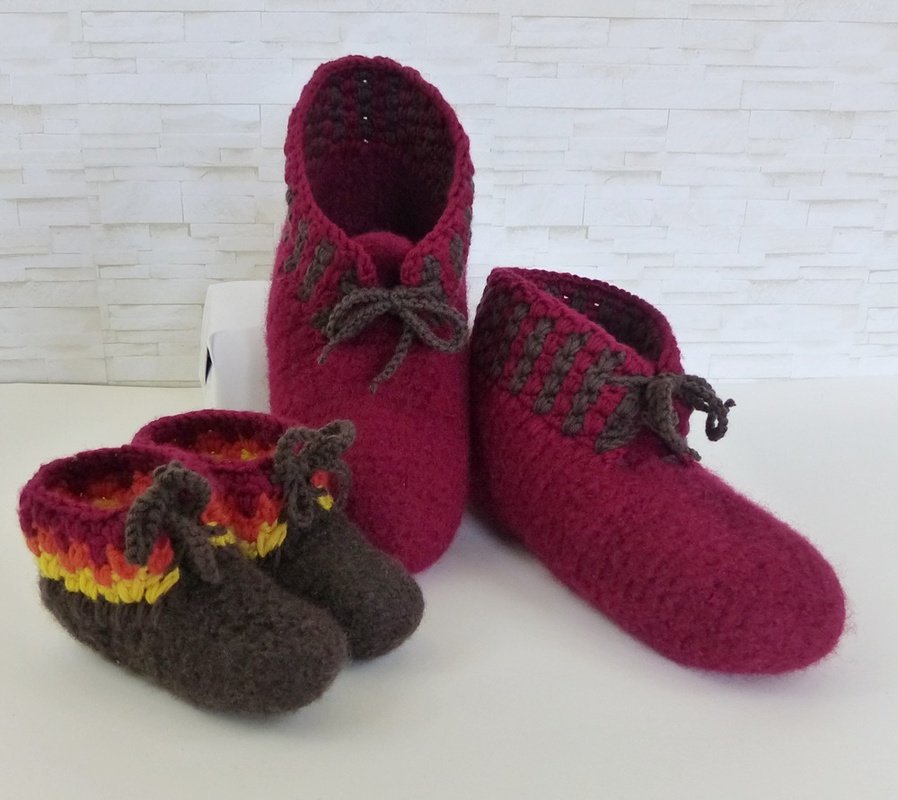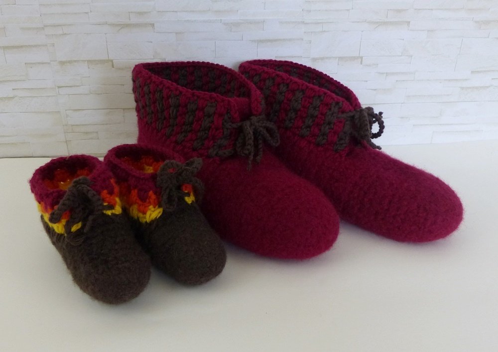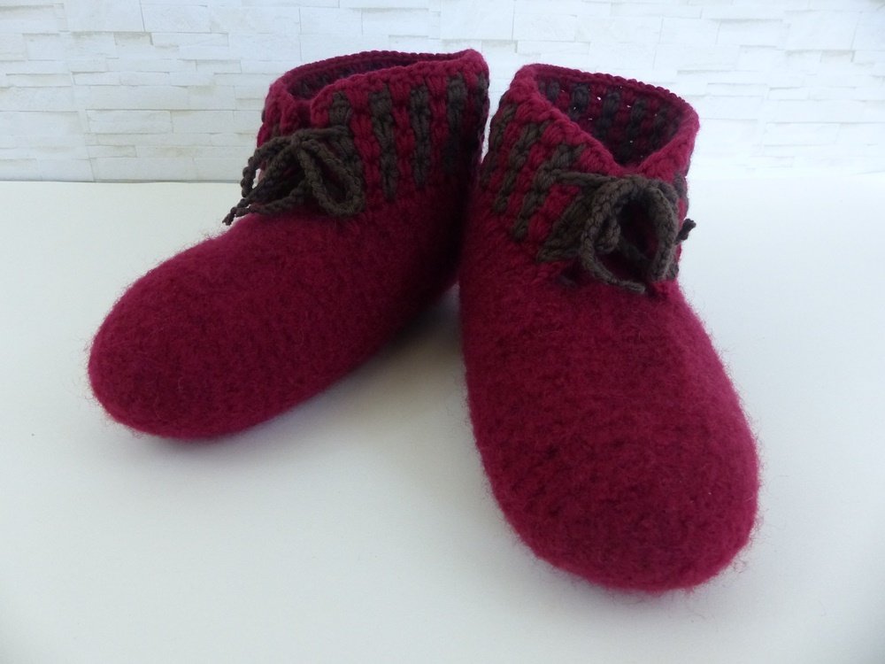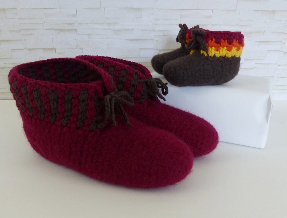 "MeiHomies 2.0" sind schöne dicke gehäkelte Filzpuschen / Hausschuhe / Hüttenschuhe / Puschen. Die Schuhe haben einen zusätzlich angehäkelten Kragen und können zugebunden werden. Sie sind garantiert warm und kuschelig. Es sind die besten Freunde - wenn man warme Füße liebt.