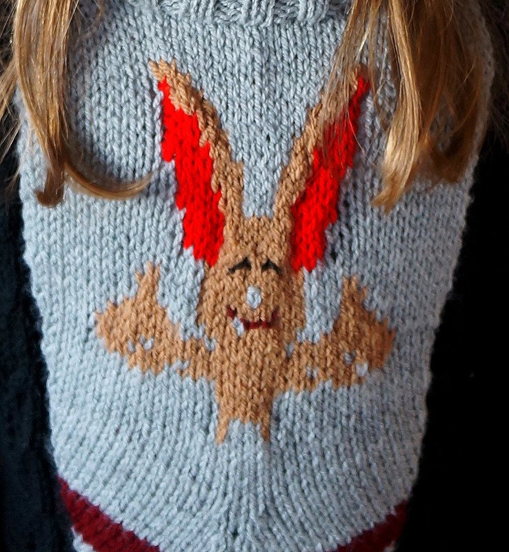 Materialverbrauch (abhängig von der Wolle) ca. 100-150gr. schwarz, 100-150gr. grau, 50gr. dunkelrot, und für das Feldermausmuster ein wenig hellbraun und hellrot.