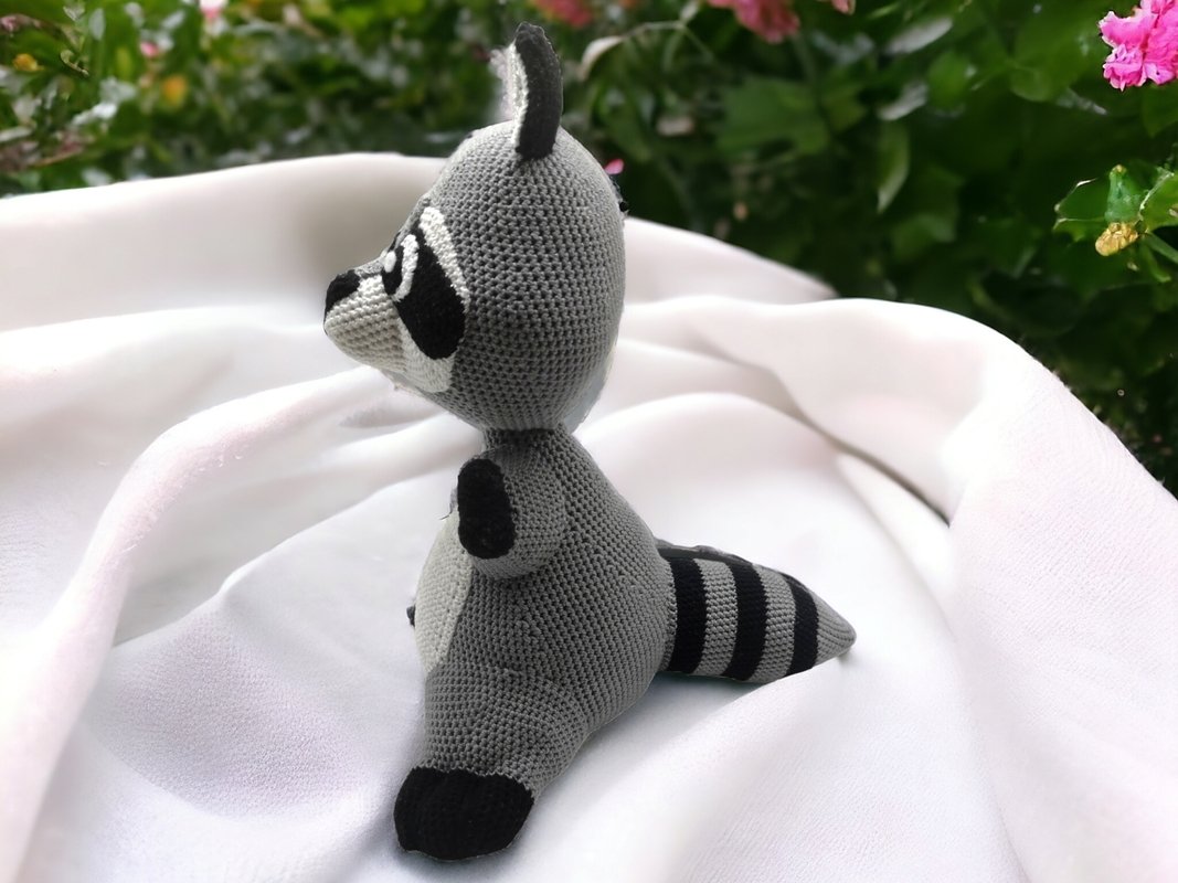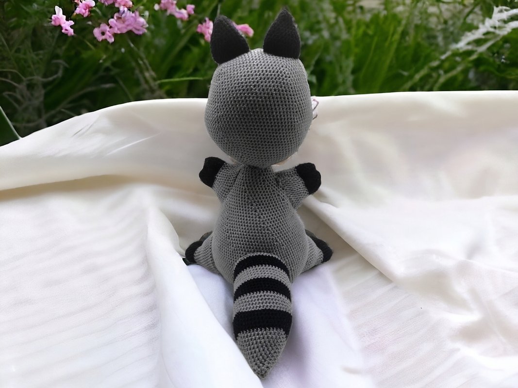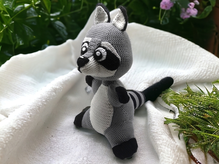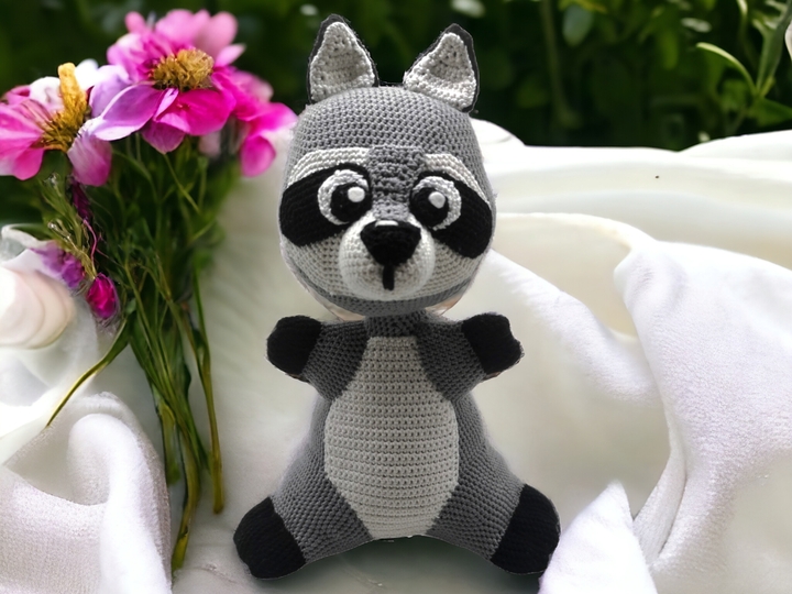 Der fertige Waschbär wird ca. 33cm hoch. Natürlich kann die Größe variieren, je nachdem ob man fest oder locker häkelt. Auch die Wahl der Wolle ist entscheidend.
