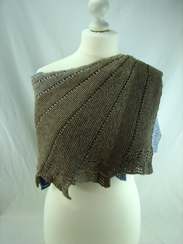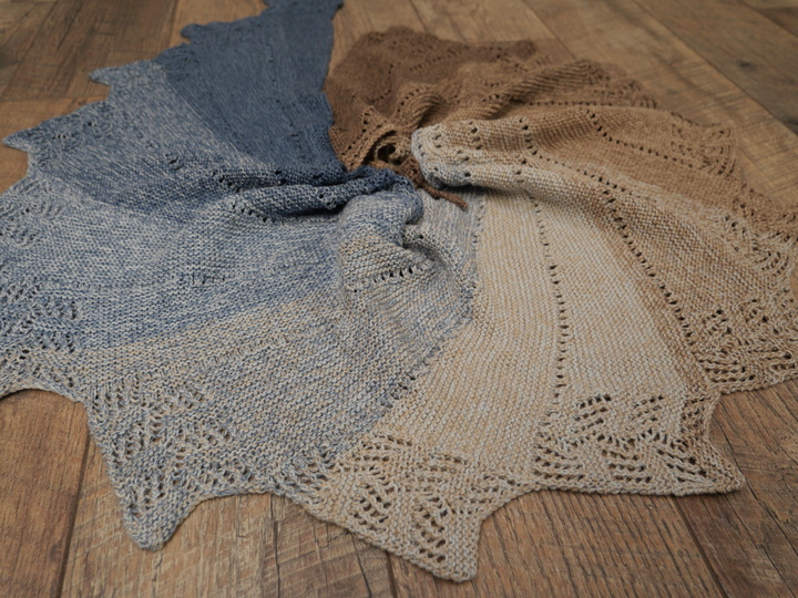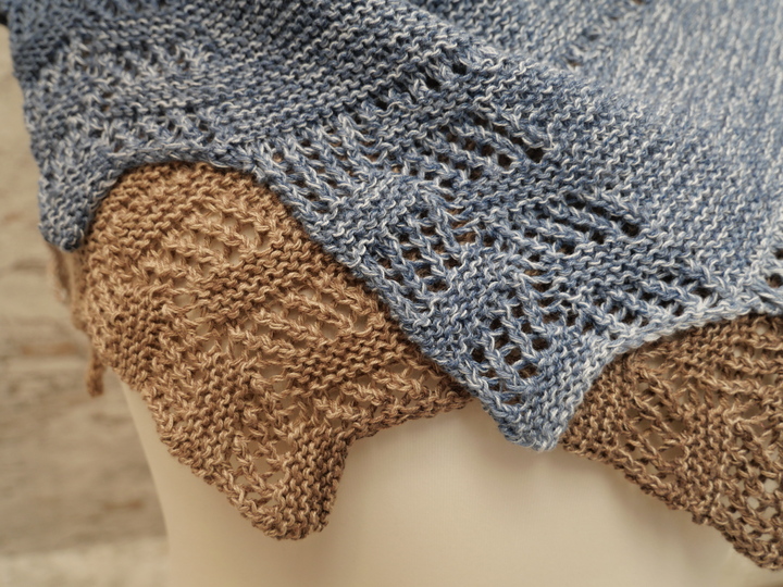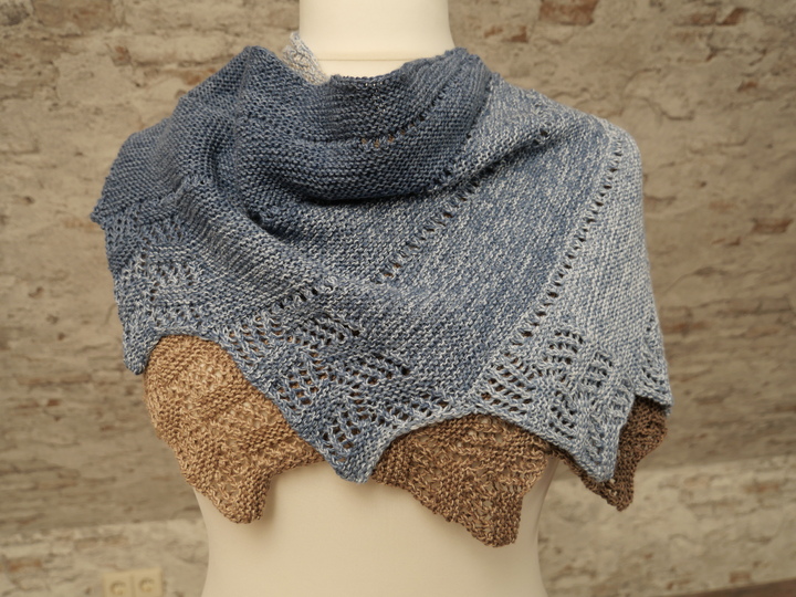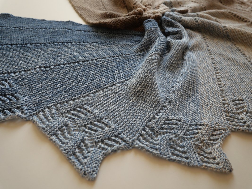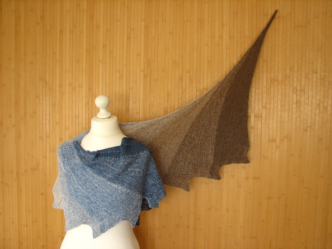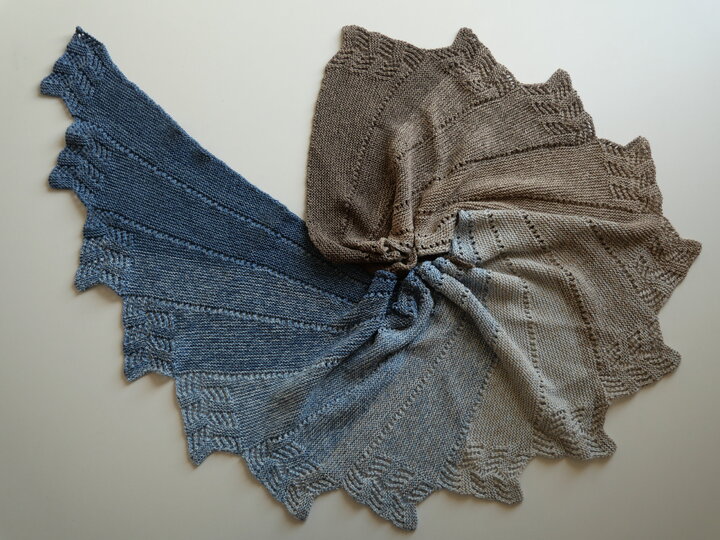 Das abgebildete Tuch besteht aus 15 Segmenten, die größtenteils mit rechten Maschen gestrickt werden. Jedes Segment ist in sich abgeschlossen, dadurch kann das Tuch leicht in der Spannweite angepasst werden. Gestrickt habe ich es mit einem Farbverlaufsgarn, man kann aber auch jedes Segment in einer anderen Farbe stricken bzw. natürlich auch komplett in uni.