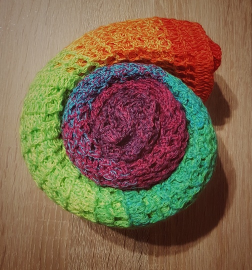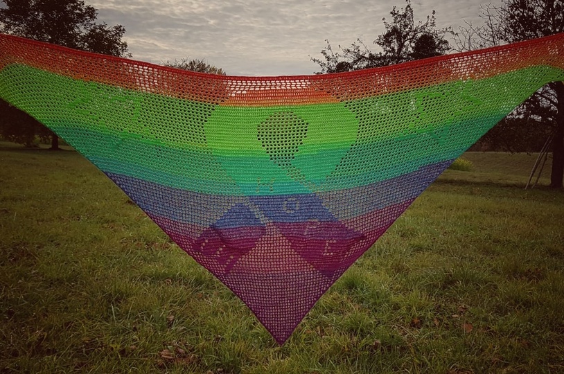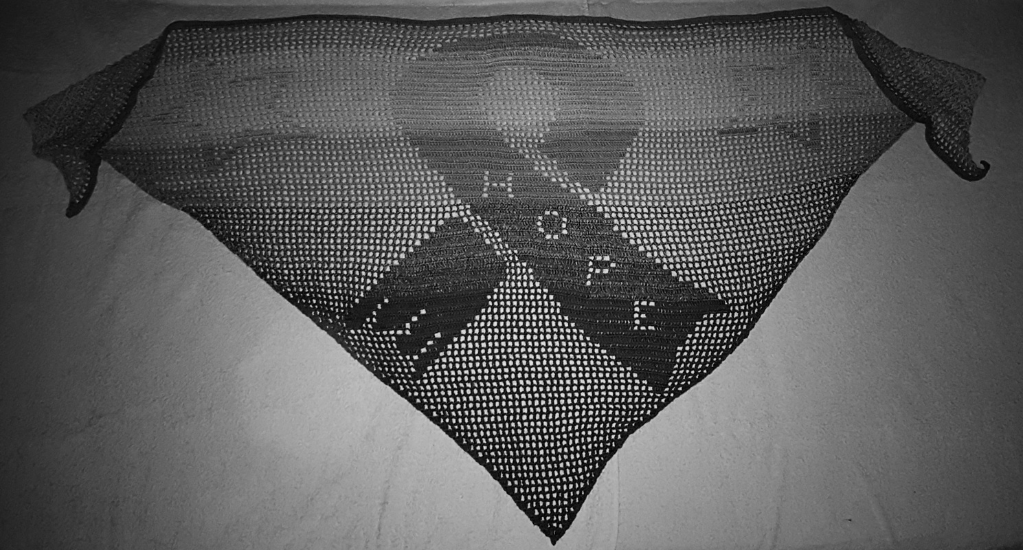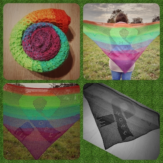 Das Motivtuch "Hope" wurde mit ca. 1050 Metern LL sowie 3 fädigem Farbverlaufsgarn und einer 3,5er Nadel locker gehäkelt. Es hat die Maße: ca. 200 cm x 85 cm