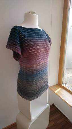 Je nach Größe und Länge, die Ihr arbeiten wollt benötigt Ihr eine andere Lauflänge an Garn. Dies ist in der Anleitung mit angegeben. Ich habe für Konfektionsgröße 36 1500m Lauflänge eines Farbverlaufgarns benötigt.