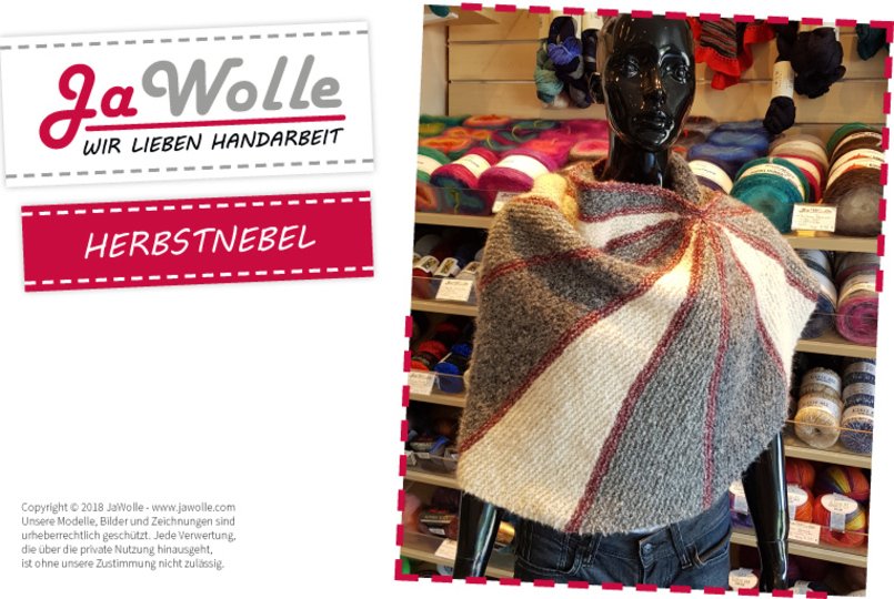 Die Anleitung Tuch Herbstnebel (ca. 50 x 160 cm) ist sehr ausführlich mit kompletten Strickschriften für das gesamte Tuch geschrieben. Gezeichnet sind alle Reihen, aufgeteilt in Rapporte nach Strickschriften.