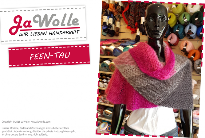 Die Anleitung Feen-Tau ist sehr ausführlich mit kompletten Strickschriften für das gesamte Tuch geschrieben. Auf diese Art ist die Anleitung für fortgeschrittene Anfänger mit Kenntnissen im Strickschriften-Lesen geeignet. Benötigt werden Rundstricknadeln Nr. 6,00 in verschiedenen Längen oder Nadelspitzen Nr.6,00 mit verschieden langen Seilen (60, 80, 100 cm).