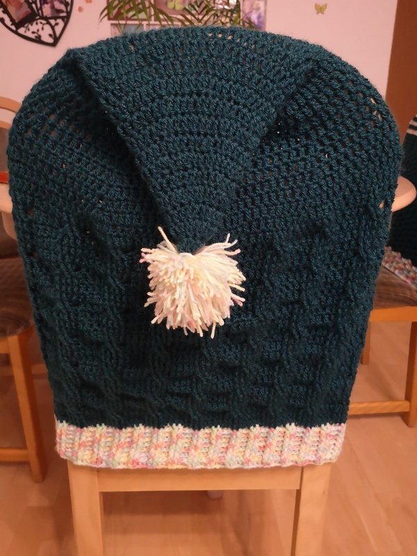 Somit hat die Stuhlhusse die Maße; Durchmesser Stuhllehne 85 cm, Höhe Stuhllehne 52 cm. Größe anpassbar