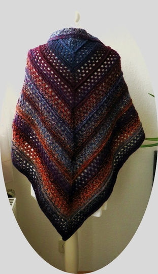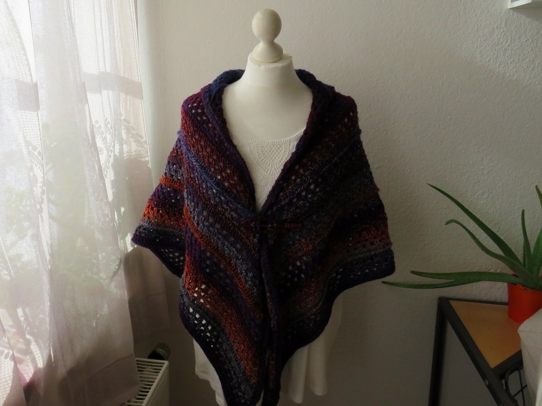 Das Tuch ist aus der Schoppel- Wolle Zauberwolle mit dem Farbverlauf Oxyde gehäkelt. Für diese Wolle ist die Häkelnadel 3 oder 3,5 empfohlen, ich habe sie mit der Häkelnadel 5 verarbeitet, das macht das winterliche Tuch lockerer und nicht so schwer.