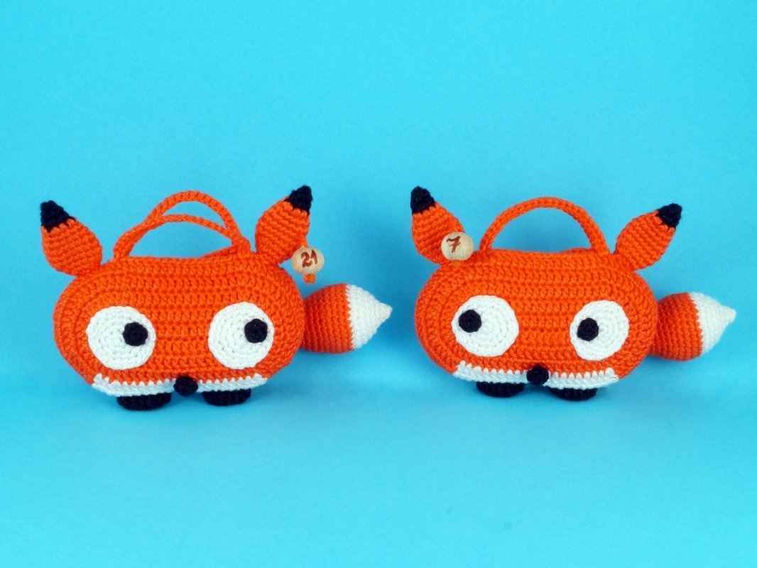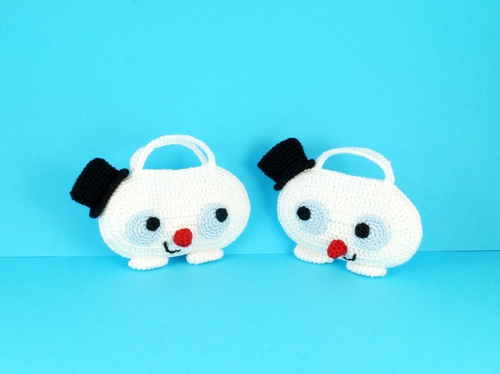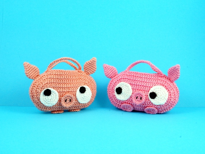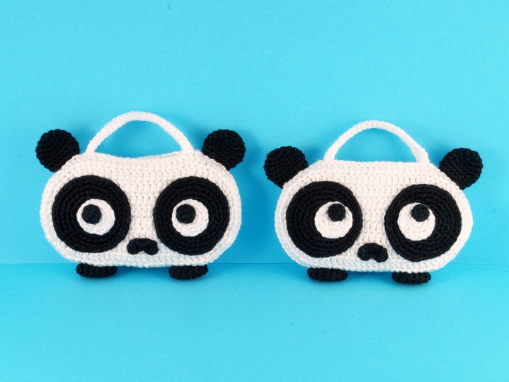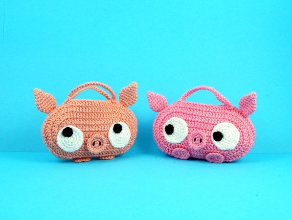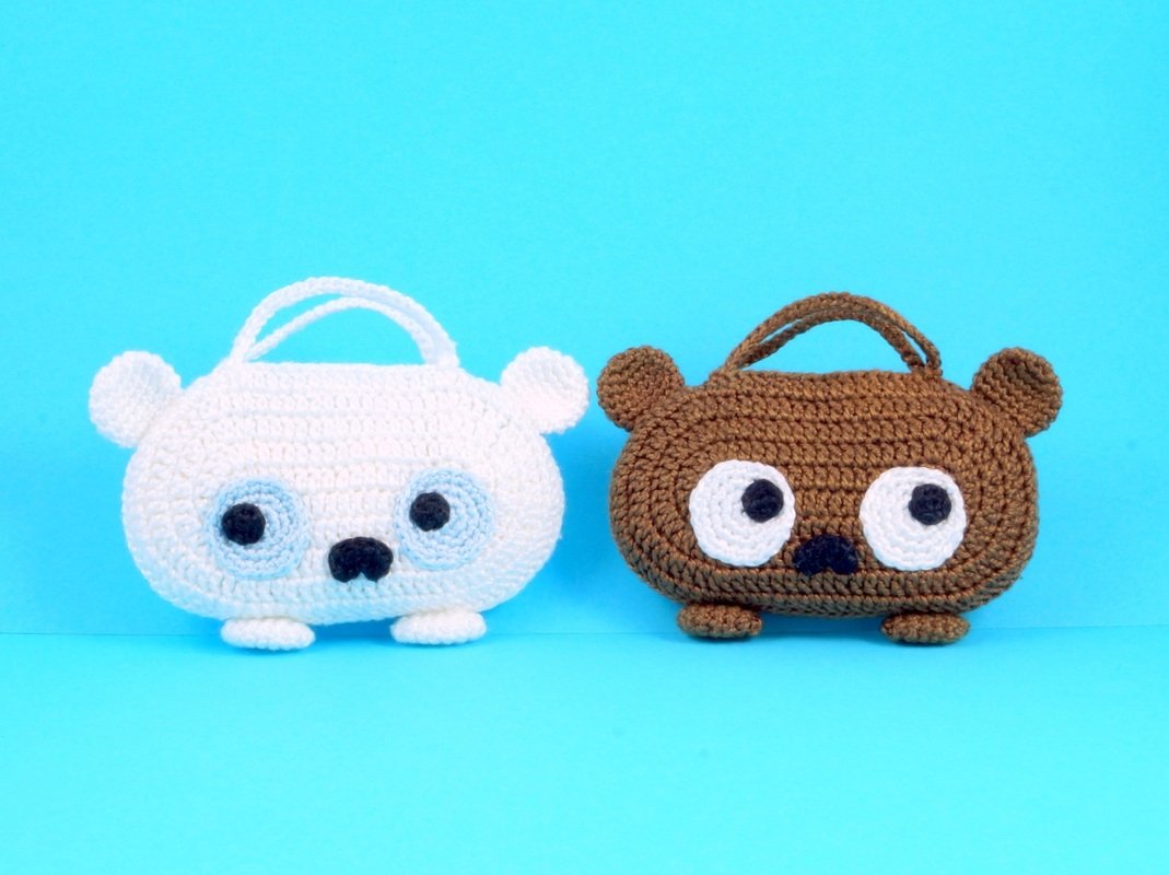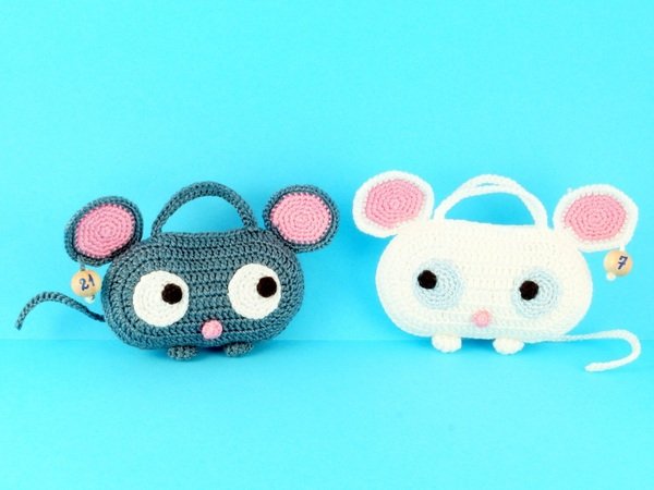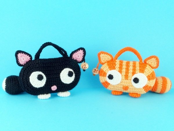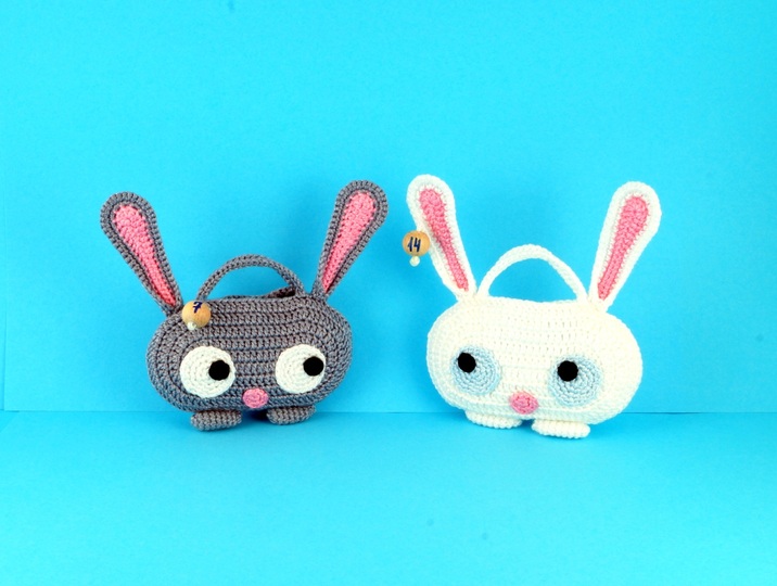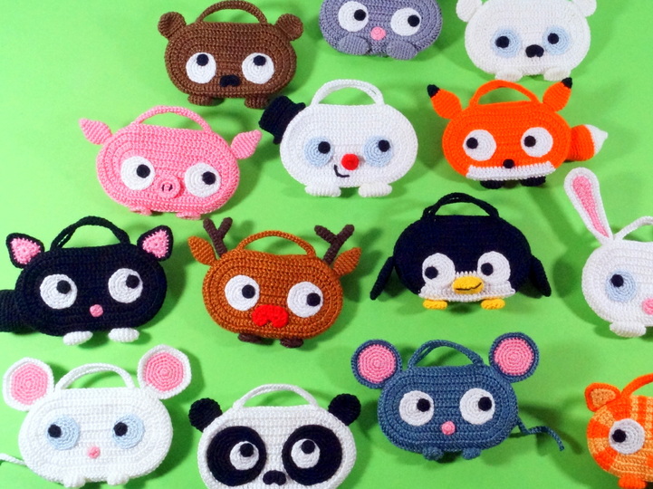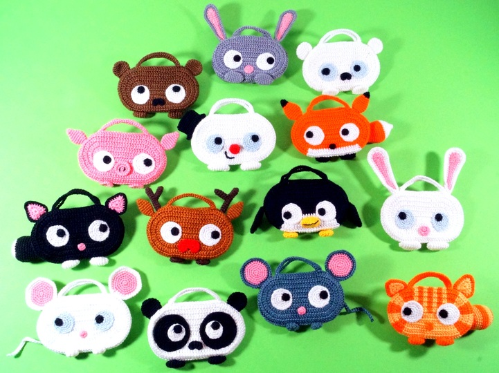 Größe: je nach Wolle, z.B. mit Wolle LL 125 m / 50 g gehäkelt wird jede Tasche ca. 12 cm breit und 7 cm hoch (ohne Ohren und Schwänze).
