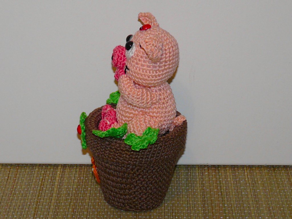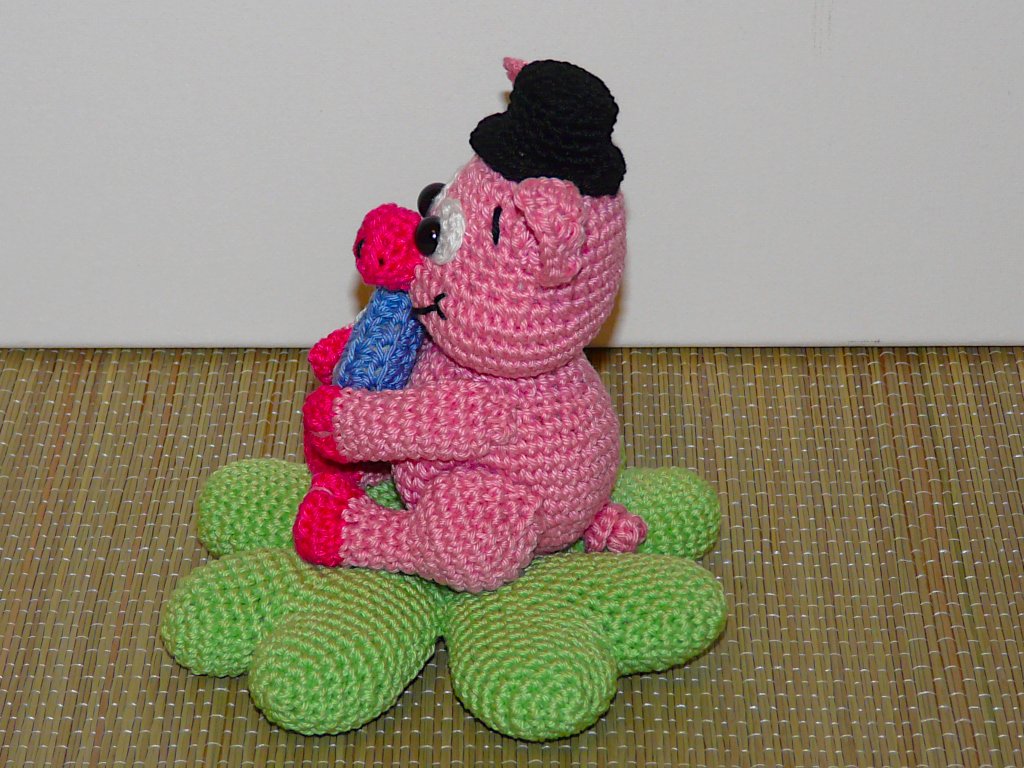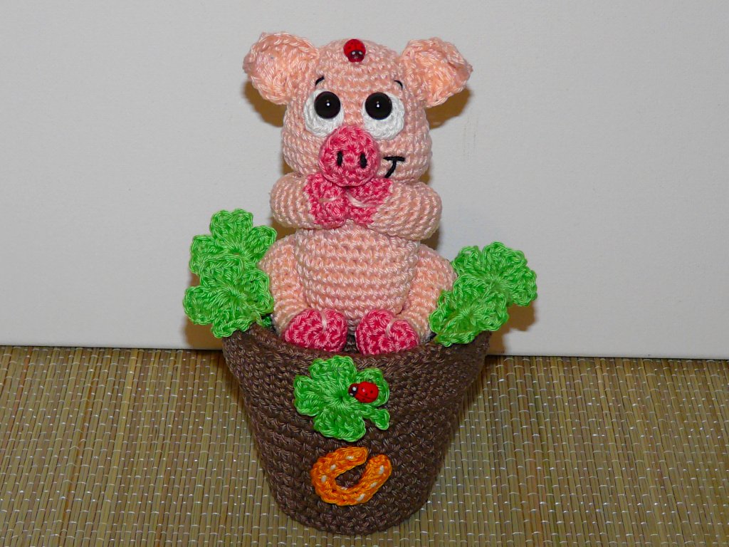 Ich beschreibe euch in dieser Anleitung wie ihr die Schweinchen, das große Kleeblatt, die Deko und den Blumentopf häkeln könnt.