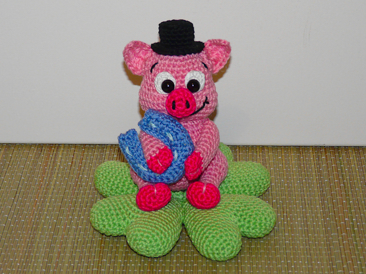 Je nach Garn- und Häkelnadelstärke variiert die Größe von den Schweinchen, dem Blumentopf, dem Kleeblatt und der Deko.